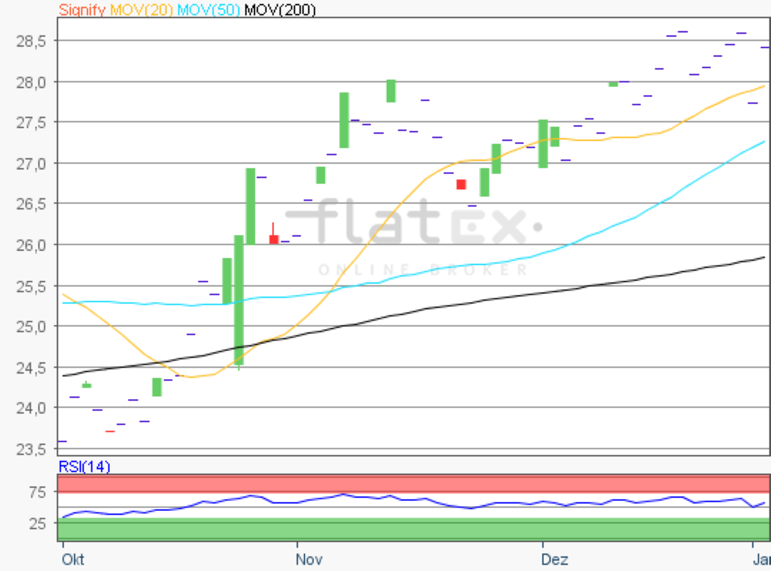 Die Aktie des Konzerns Signify (ehemalige Philips Lighting) notierte am 24. Dezember 2019 auf einem Hoch von 29,14 Euro.