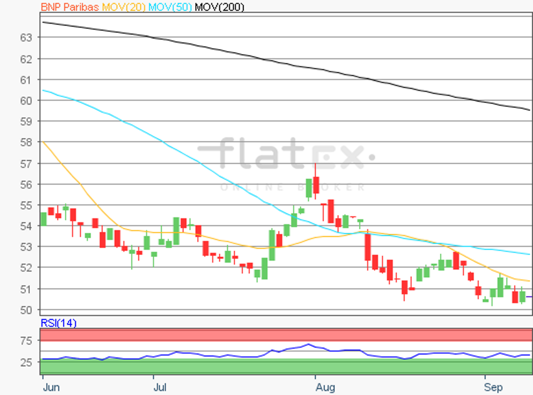 Die Aktie des Eurostoxx50-Konzerns BNP Parisbas notierte am 20. Juli 2018 mit 51,21 Euro auf einem Verlaufstief.