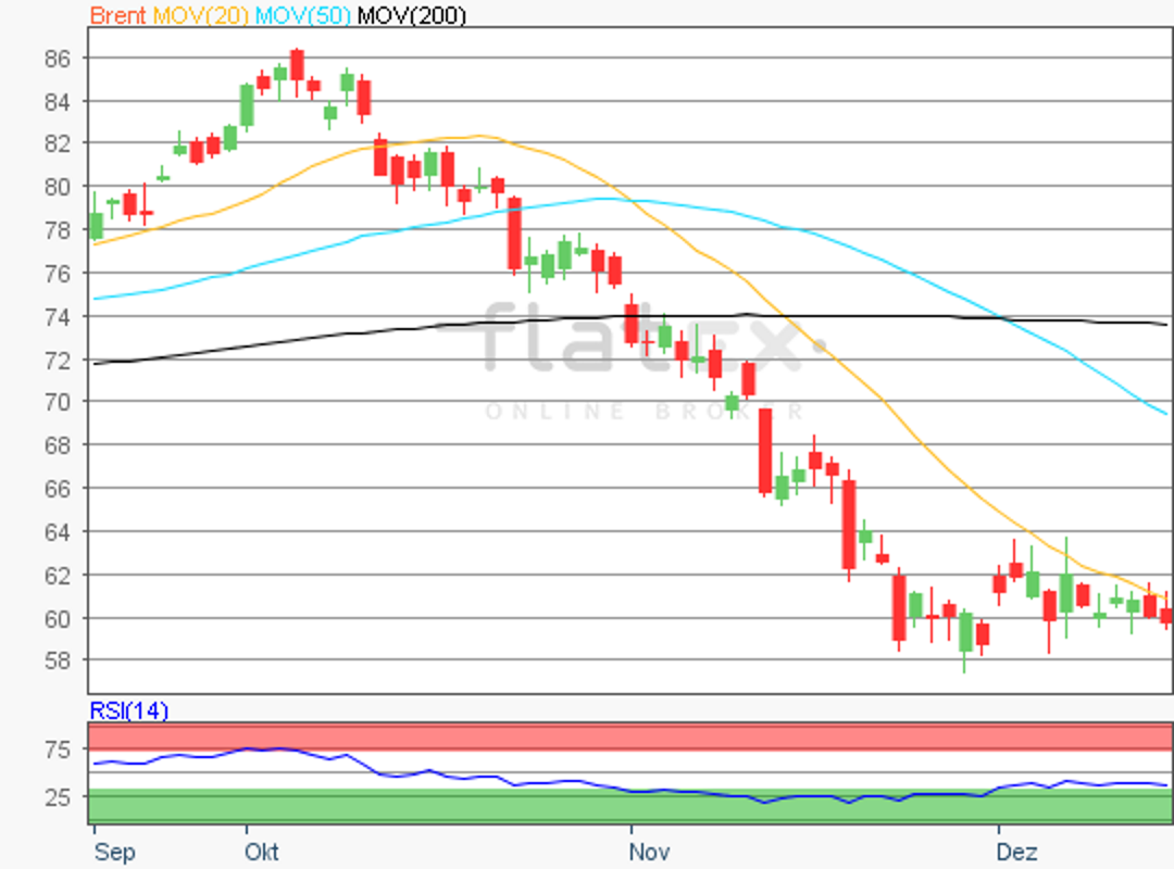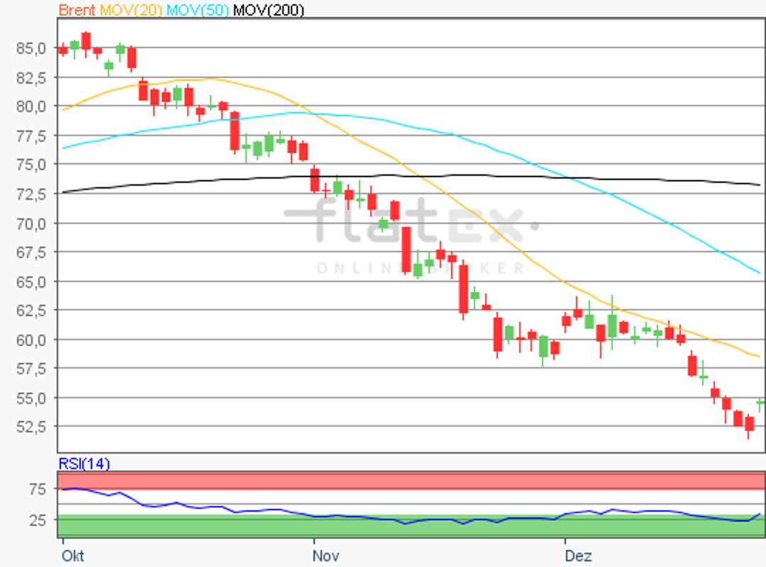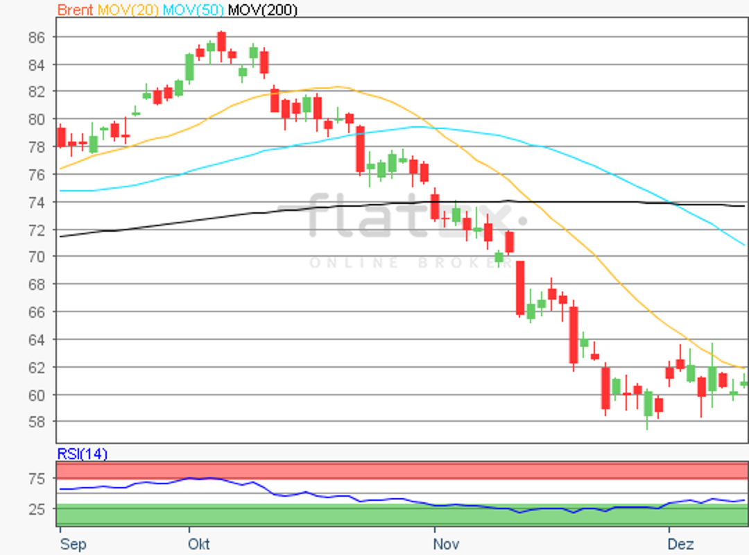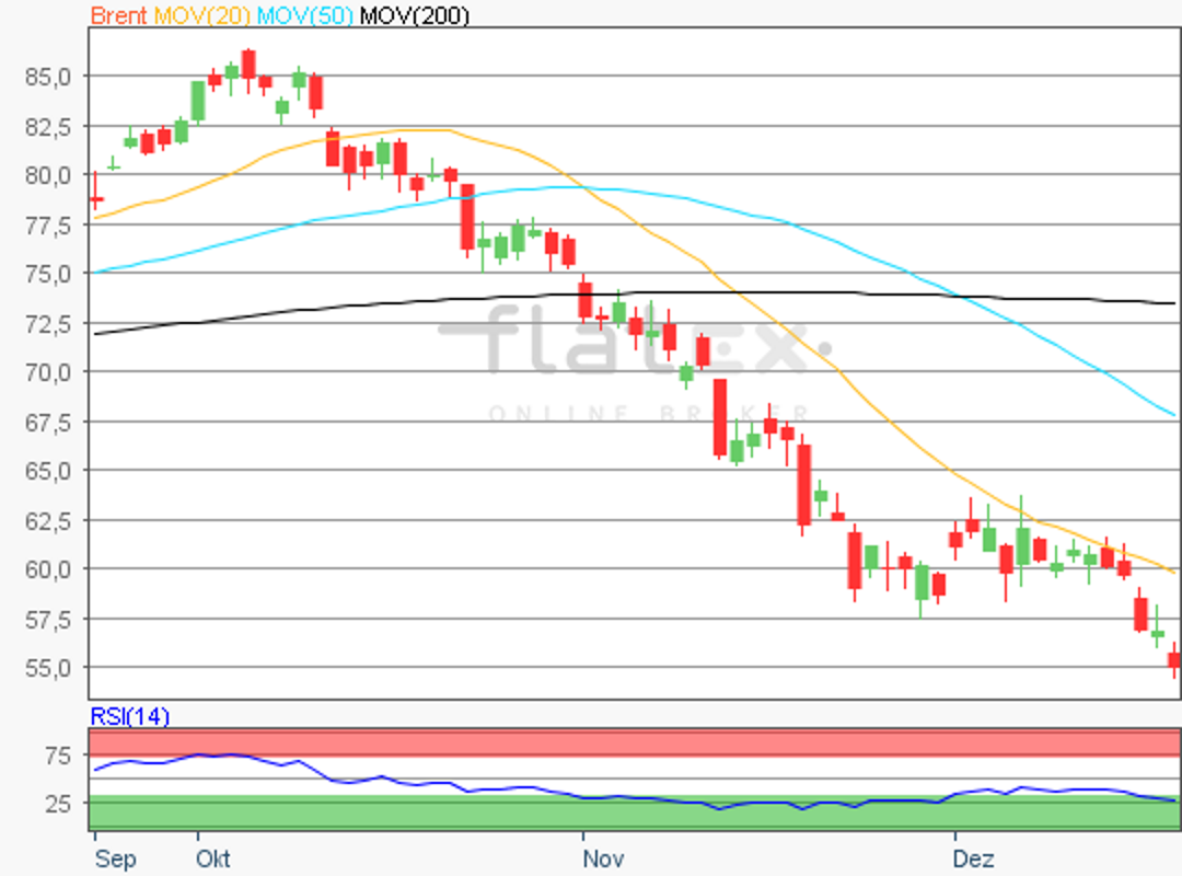 Der Preis für ein Fass Rohöl der Nordseesorte Brent im März-Kontrakt an der ICE fiel auch in den letzten Handelstagen des Jahres 2018 nach kurzfristigen Erholungstendenzen zurück.
