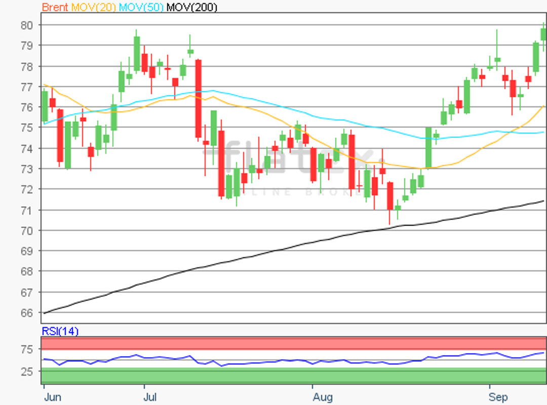 Der Preis für ein Fass Rohöl der Nordseesorte Brent im November-Kontrakt an der IPE überschritt bereits am 12. September die Marke von 80,00 US-Dollar und bildete bei 80,13 US-Dollar ein neues Jahreshoch aus.
