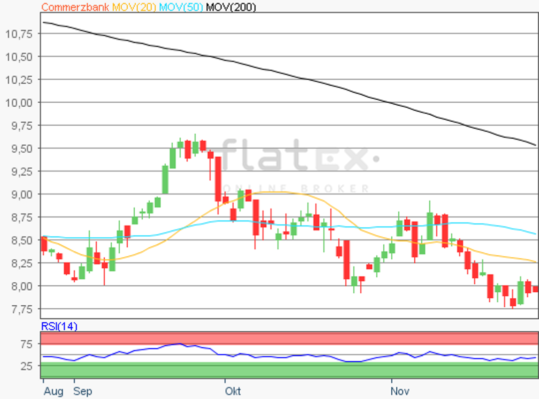 Die Aktie des MDAX-Konzerns Commerzbank notierte am 27. Juni 2018 mit 7,91 Euro auf einem Zwischentief.