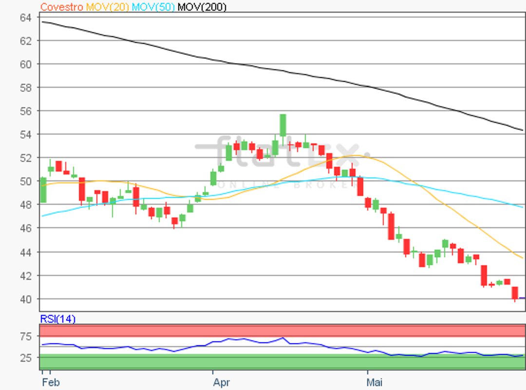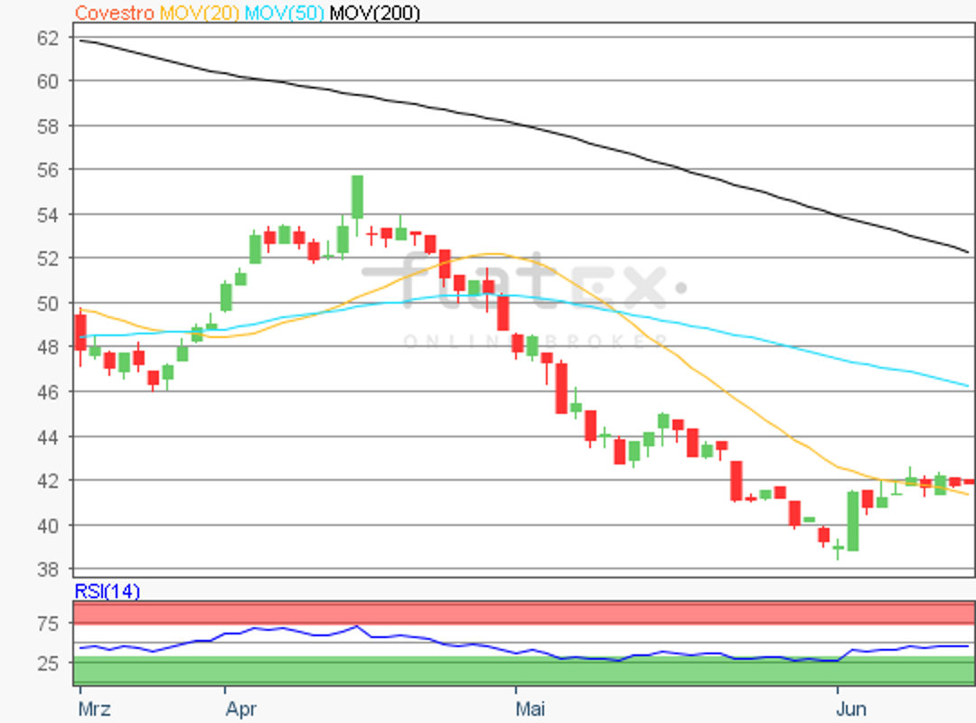 Die Aktie des DAX-Konzerns Covestro notierte am 03. Juni 2019 bei 38,43 Euro auf einem letzten Verlaufstief.