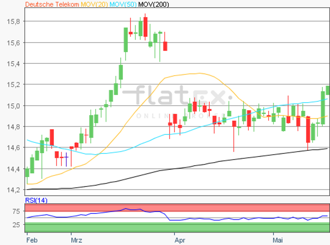 Die Aktie der Deutschen Telekom notierte am 23. Mai 2017 bei 18,15 Euro auf einem langfristigen Hoch.