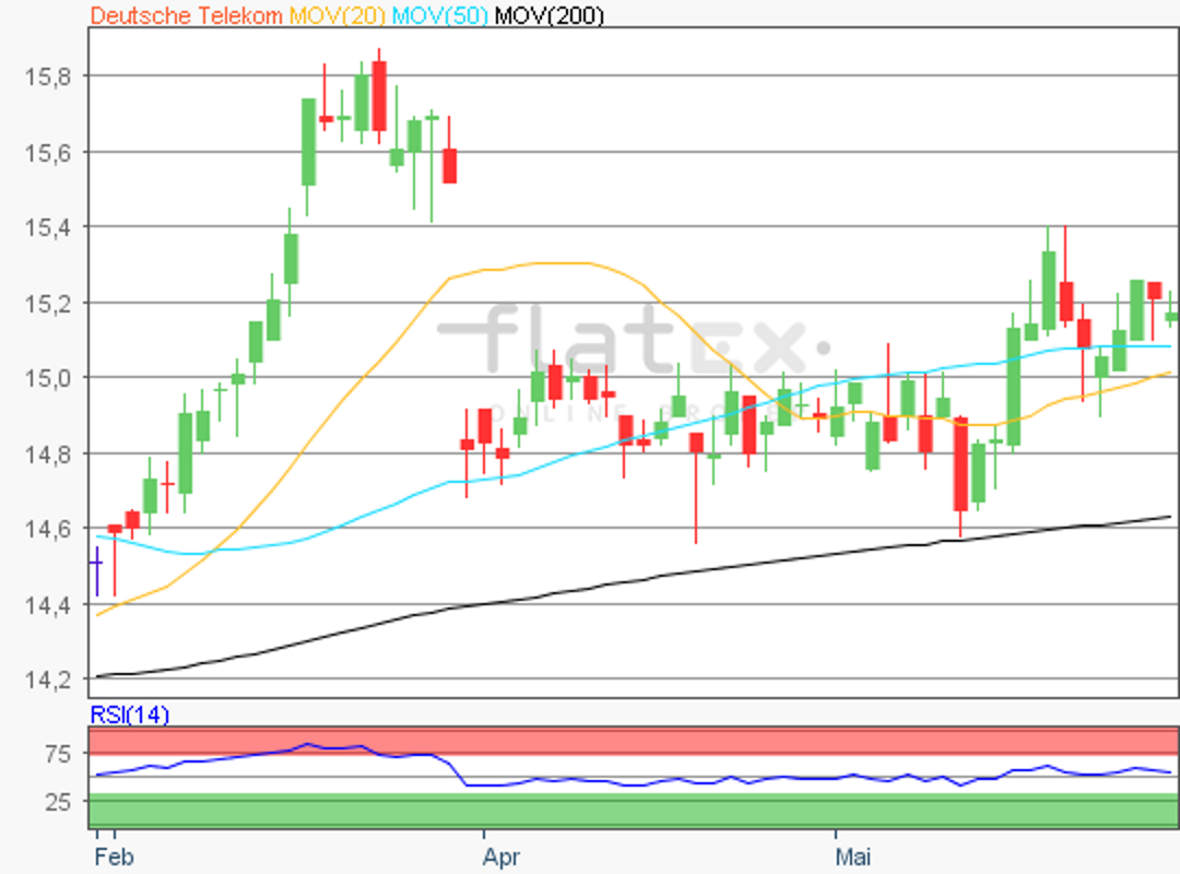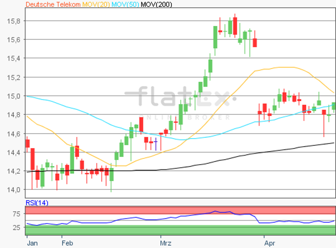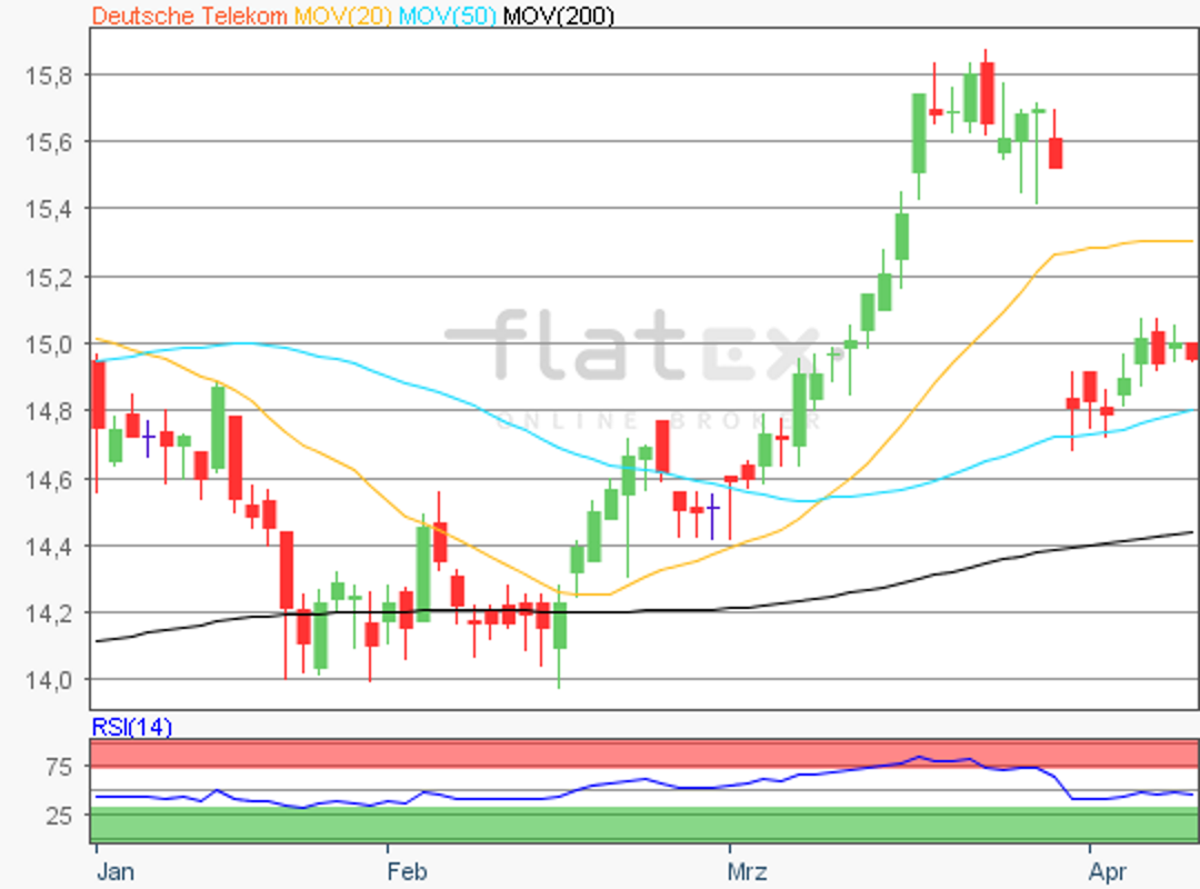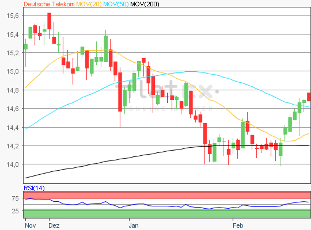 Die Aktie des DAX-Konzerns Deutsche Telekom notierte am 21. März 2018 bei 15,89 Euro auf einem Zwischenhoch.