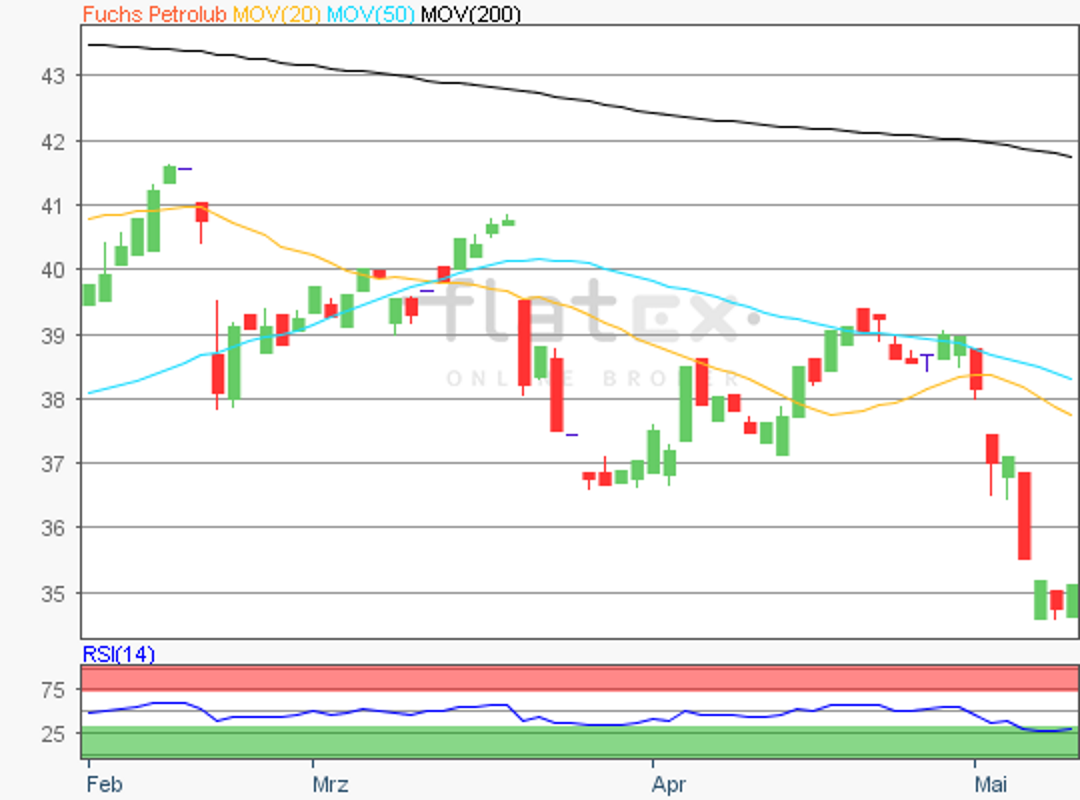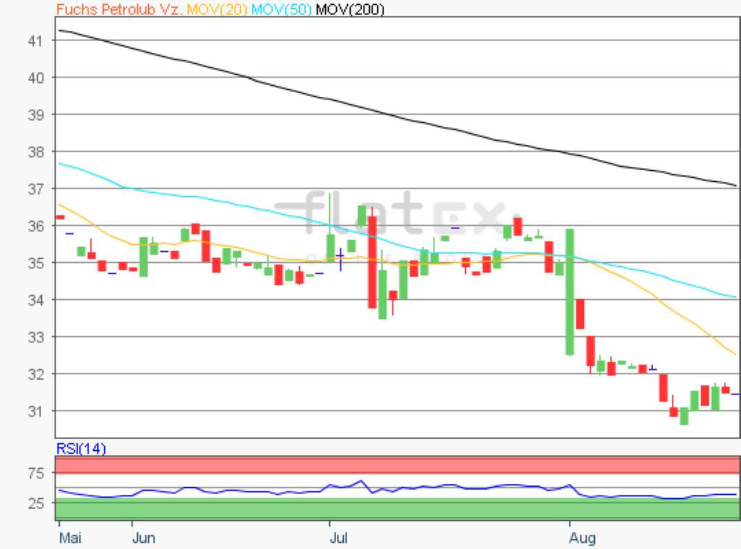 Die Vorzugsaktie des MDAX-Konzerns Fuchs Petrolub notierte am 15. August 2010 auf einem letzten Verlaufstief von 30,46 Euro.