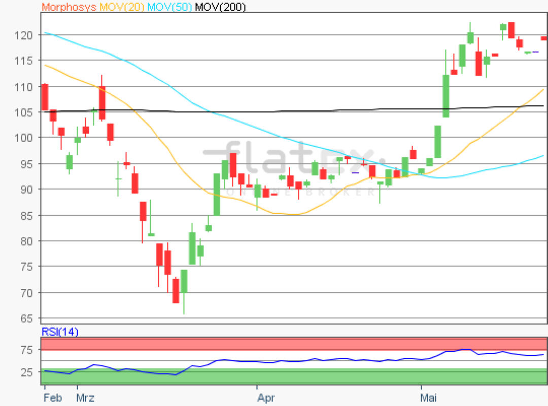 Die Aktie des MDAX- und TecDAX-Konzerns Morphosys notierte am 18. Mai 2020 auf einem jüngsten Zwischenhoch von 122,70 Euro.