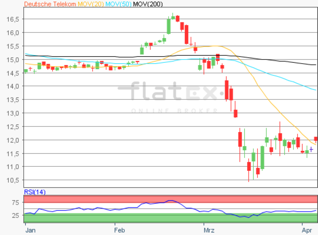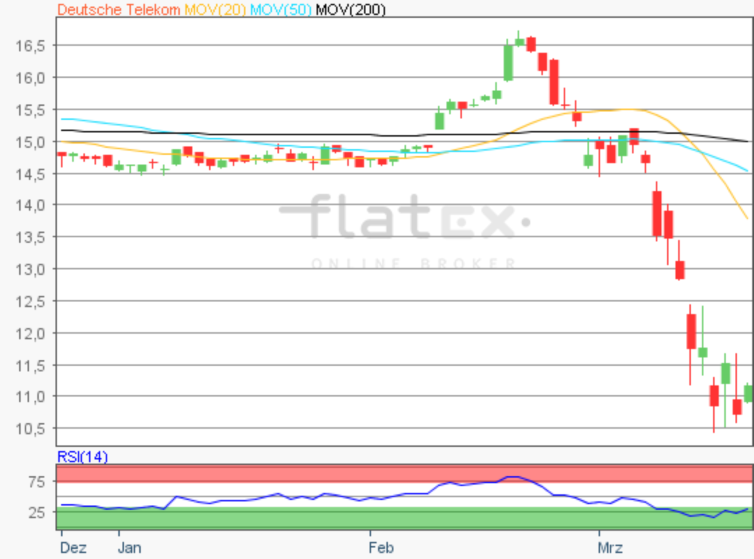Die Aktie des DAX-Konzerns Deutsche Telekom notierte am 16. März 2020 auf einem Verlaufstief von 10,40 Euro.
