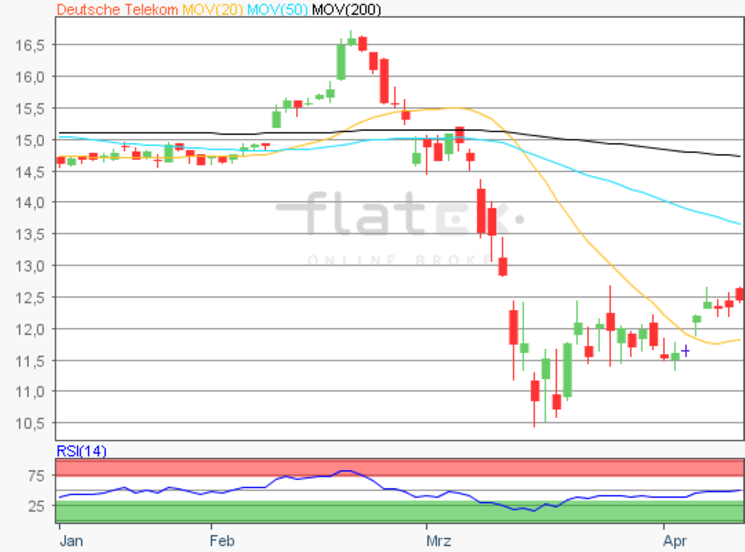 Die Aktie des DAX-Konzerns Deutsche Telekom notierte am 16. März 2020 auf einem letzten Verlaufstief von 10,40 Euro.