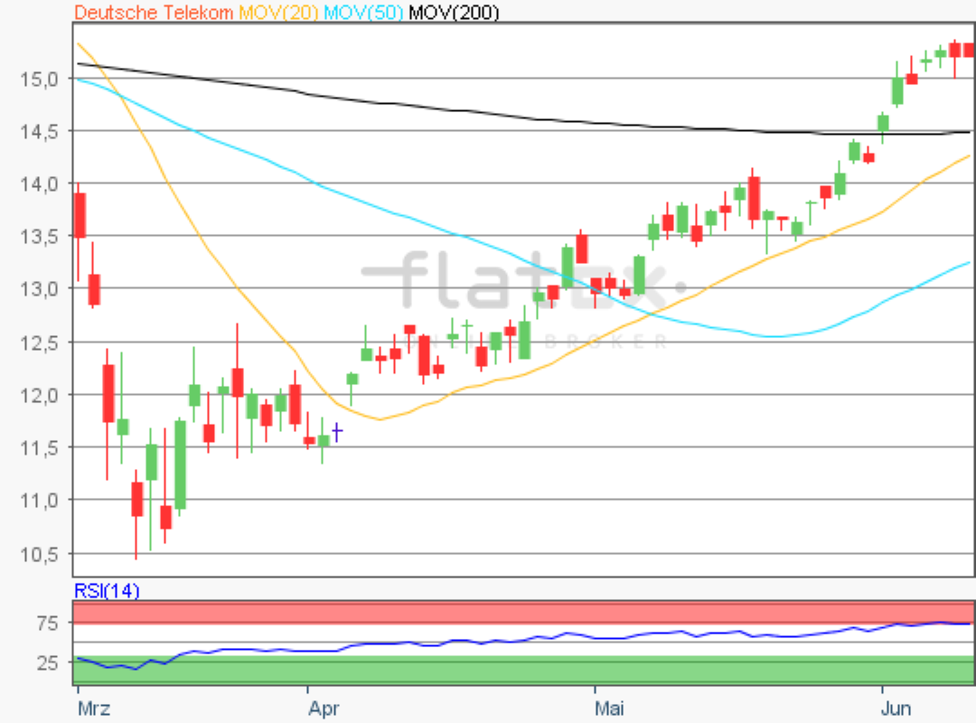 Die Aktie des DAX-Konzerns Deutsche Telekom notierte am 23. Mai 2017 auf einem letzten langfristigen Hoch von 18,15 Euro.