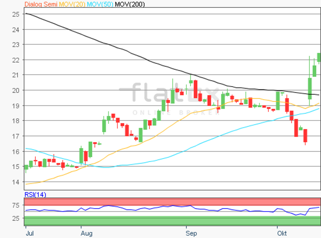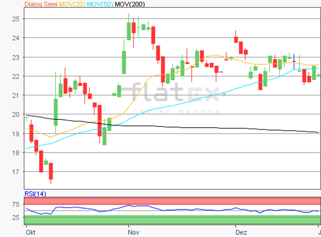 Die Aktie des TecDAX-Konzerns und Apple-Ausrüsters Dialog Semiconductor notierte am 04. September 2018 mit 20,93 Euro auf einem Zwischenhoch.