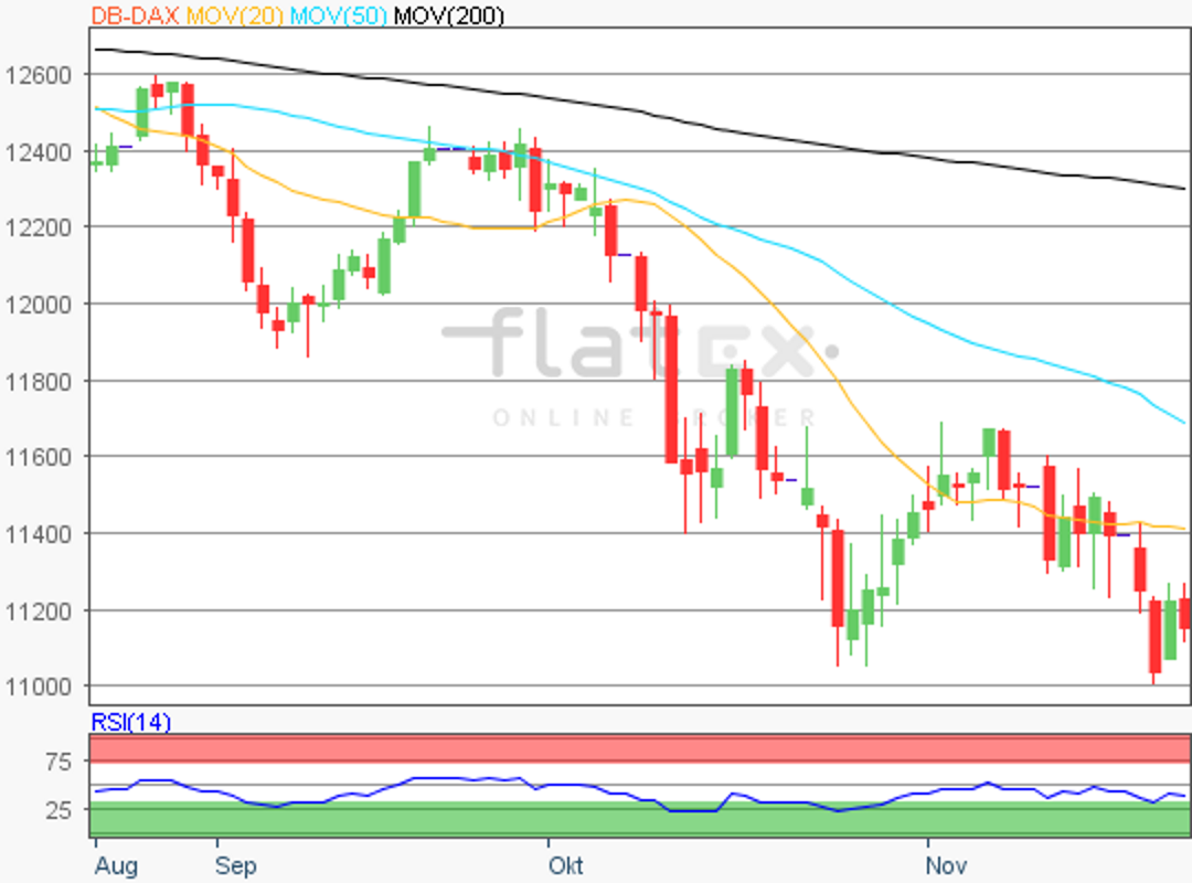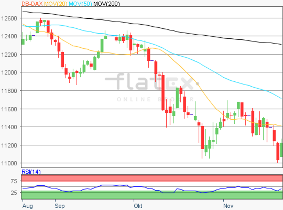 Der Deutsche Aktienindex konnte am Mittwoch mit einer kräftigen Erholungsbewegung verloren gegangenes Terrain zumindest etwas gutmachen. Nach dem neuen Jahrestief vom Dienstag bei 11.009,25 Punkten wäre nun zumindest in Kombination mit dem alten Jahrestief vom 26. Oktober bei 11.051,04 Punkten eine mögliche charttechnische Wendeformation denkbar.