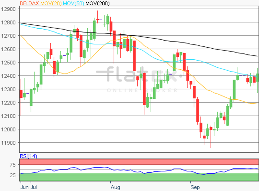 Der Deutsche Aktienindex drehte von seinem zunächst bei 12.272,65 Punkten erreichten tagestief kräftig auf und schloss dann mit einem Plus von 0,40 Prozent bei 12.435,59 Punkten.