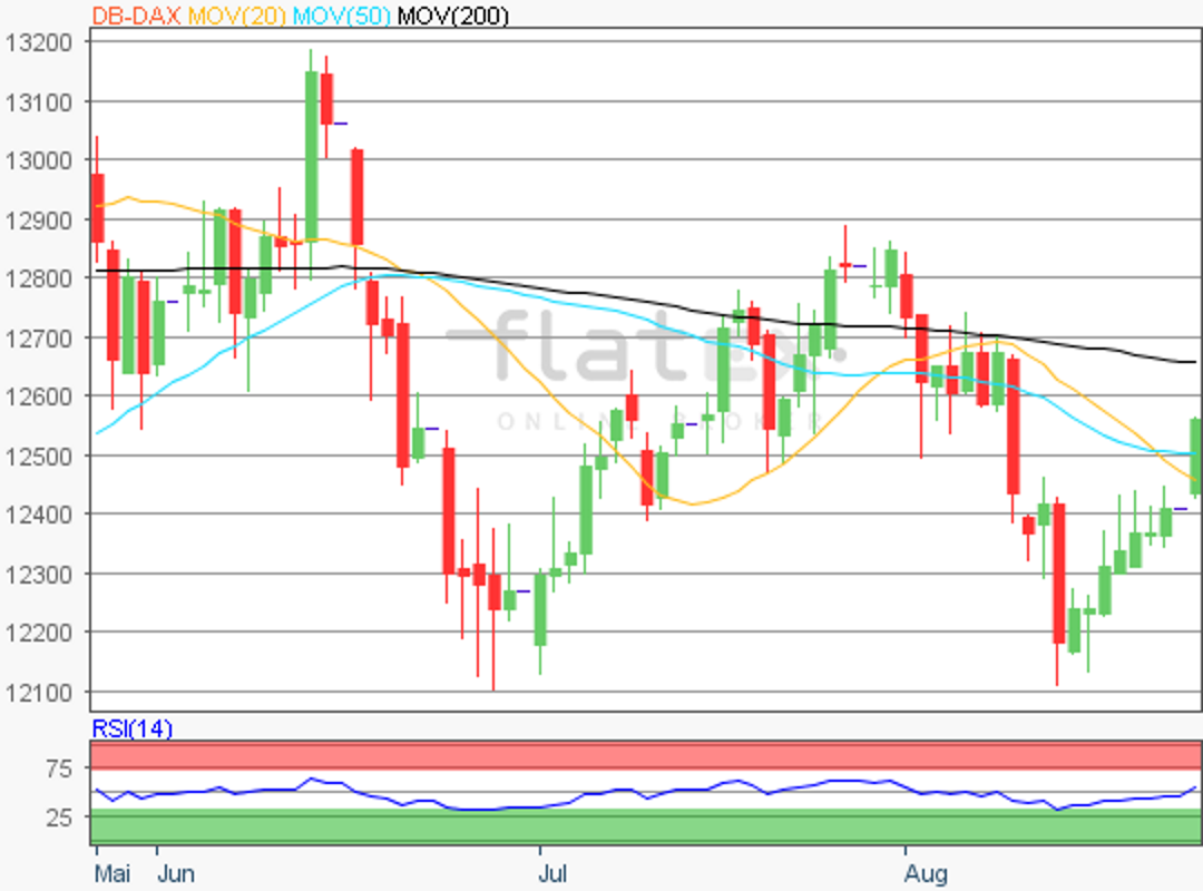 Die neue Handelswoche beginnt für den Deutschen Aktienindex mit Kursgewinnen. Zum Xetra-Schluss notierte der DAX mit einem Plus von 1,16 Prozent und 12.538,31 Punkten. Diese Performance brachte dem DAX unter den liquiden europäischen Leitindizes die Pole Position ein.