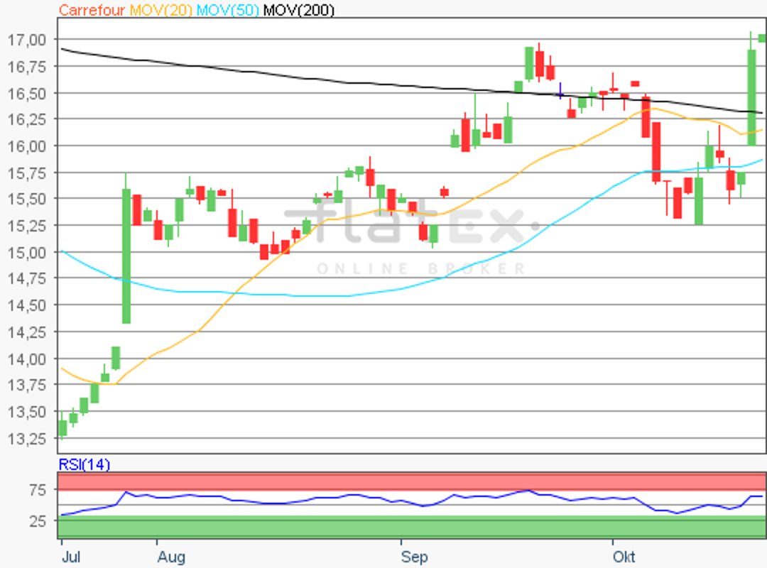 Die Aktie des französischen Einzel- und Lebensmittelhandelskonzerns Carrefour notierte am 16. September 2019 bei 17,20 Euro auf einem letzten Zwischenhoch.