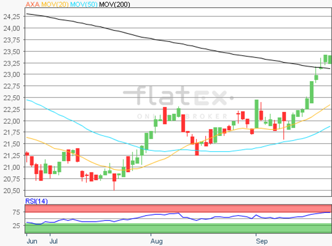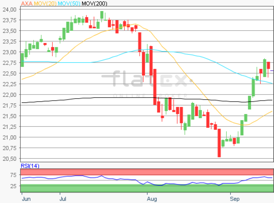 Die Aktie des französischen Versicherungskonzerns AXA notierte am 10. Oktober 2018 auf einem letzten Zwischenhoch von 23,90 Euro.