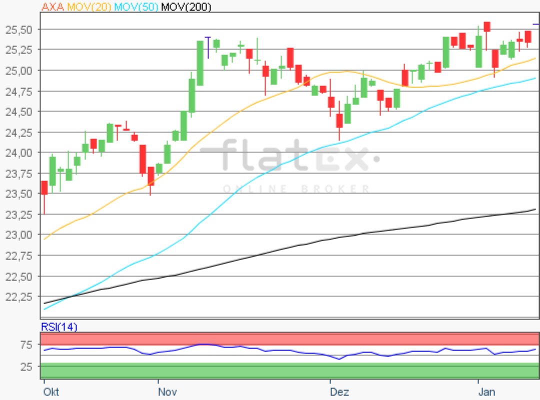 Die Aktie des französischen Versicherungskonzerns AXA notierte am 23. Januar 2018 auf einem Mehrjahreshoch von 27,69 Euro.