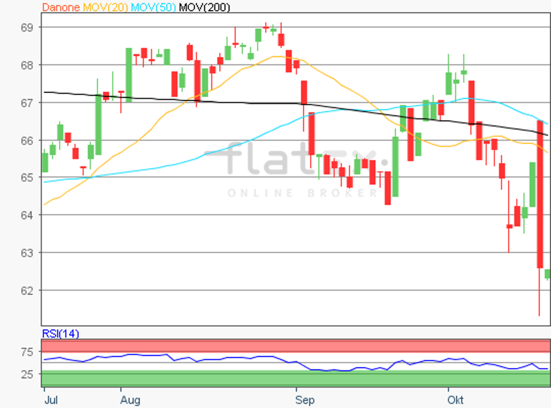 Die Aktie des EuroStoxx50-Konzerns Danone notierte am 02. Juli 2018 auf einem zwischenzeitlichen Verlaufstief von 62,24 Euro.