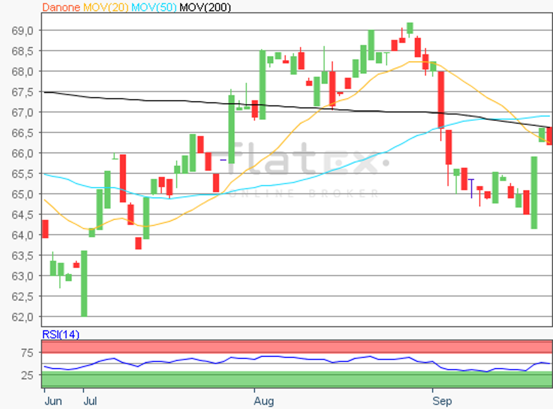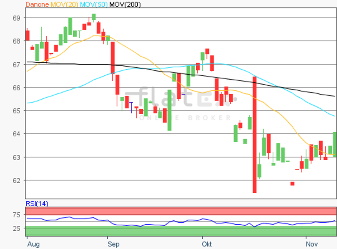 Die Aktie des EuroStoxx50-Konzerns Danone notierte am 13. November 2018 auf einem Zwischenhoch von 66,74 Euro.