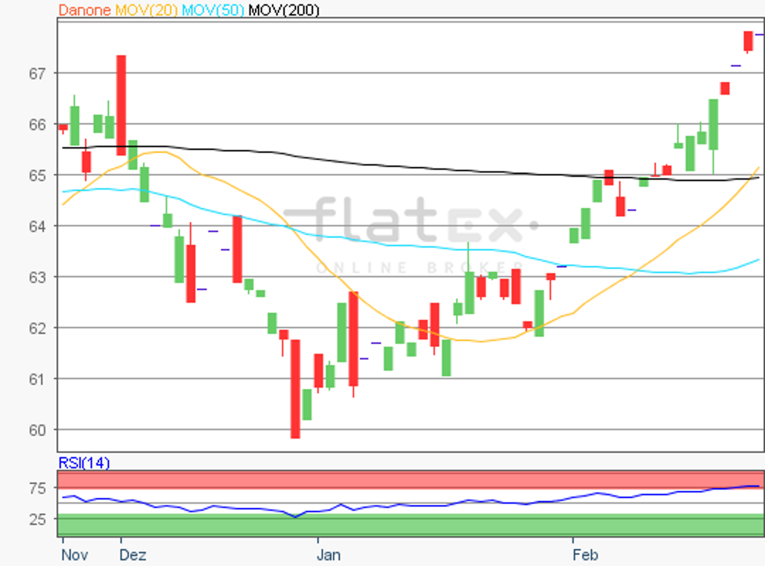 Die Aktie des EuroStoxx50-Konzerns Danone notierte am 05. Januar 2018 auf einem Jahreshoch von 71,78 Euro.