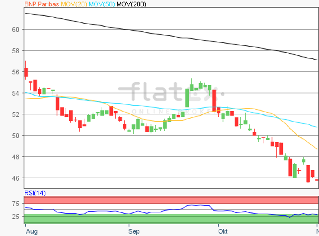 Die Aktie des Eurostoxx50-Konzerns BNP Parisbas notierte am 20. Juli 2018 mit 51,21 Euro auf einem Verlaufstief.