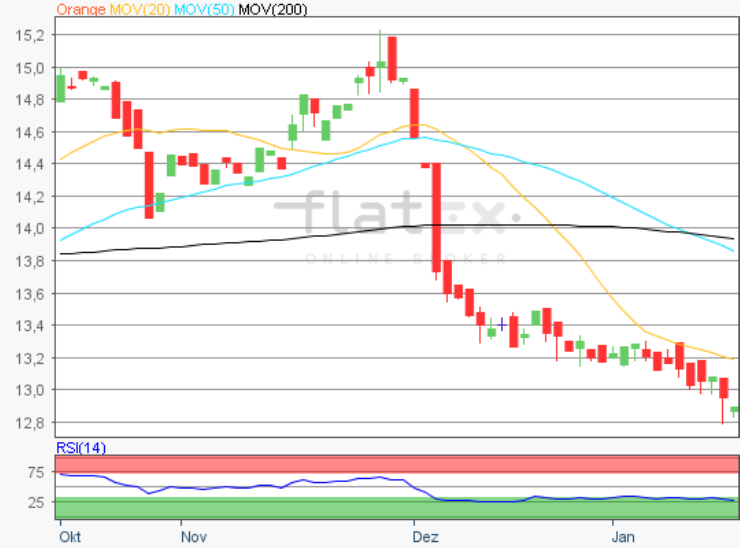 Die Aktie des französischen Telekommunikationskonzerns Orange notierte am 22. Juli 2019 auf einem Verlaufstief von 13,08 Euro.
