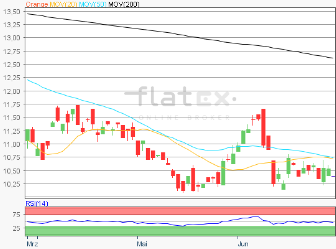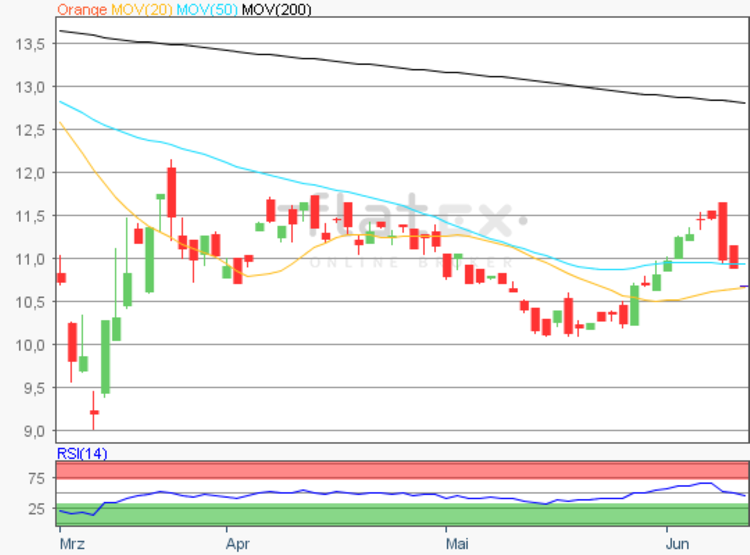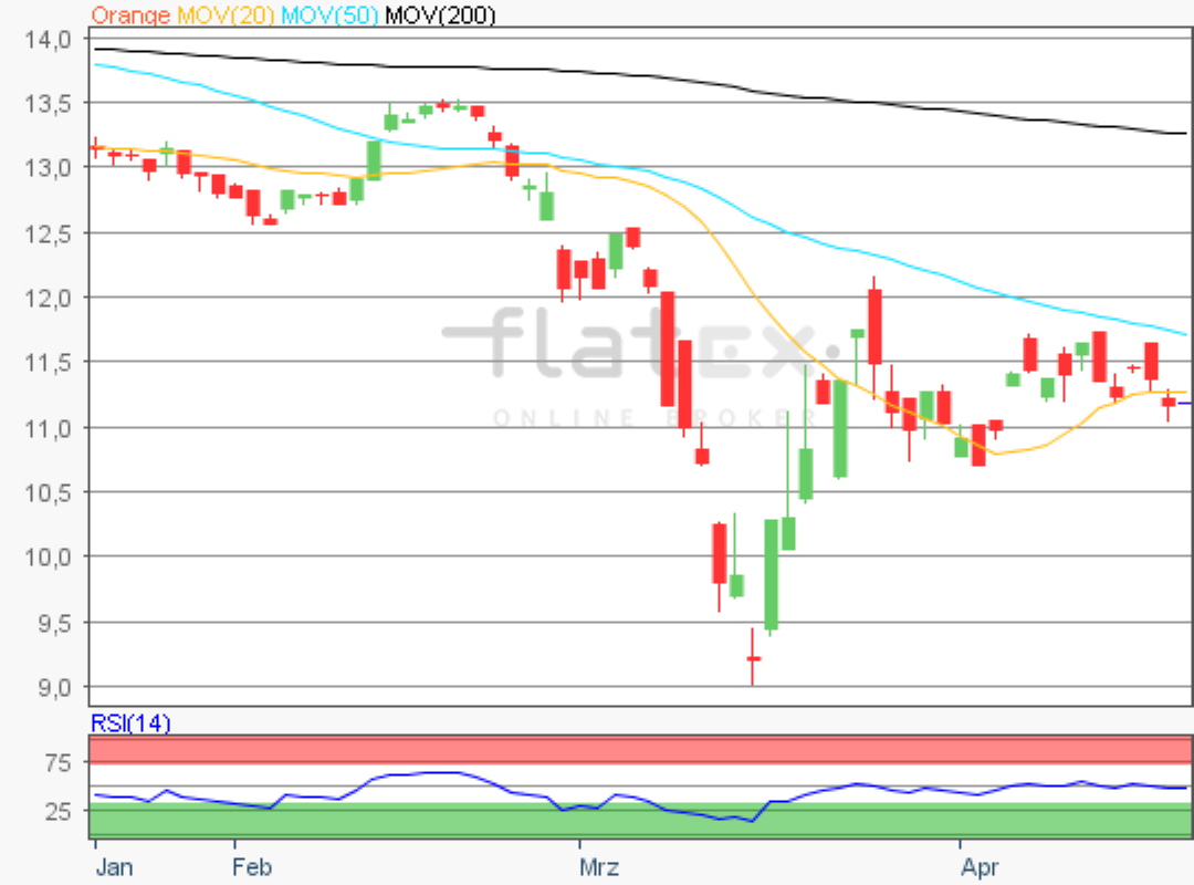 Die Aktie des EuroStoxx50-Konzerns Orange notierte am 25. März 2020 auf einem letzten Zwischenhoch von 12,24 Euro.