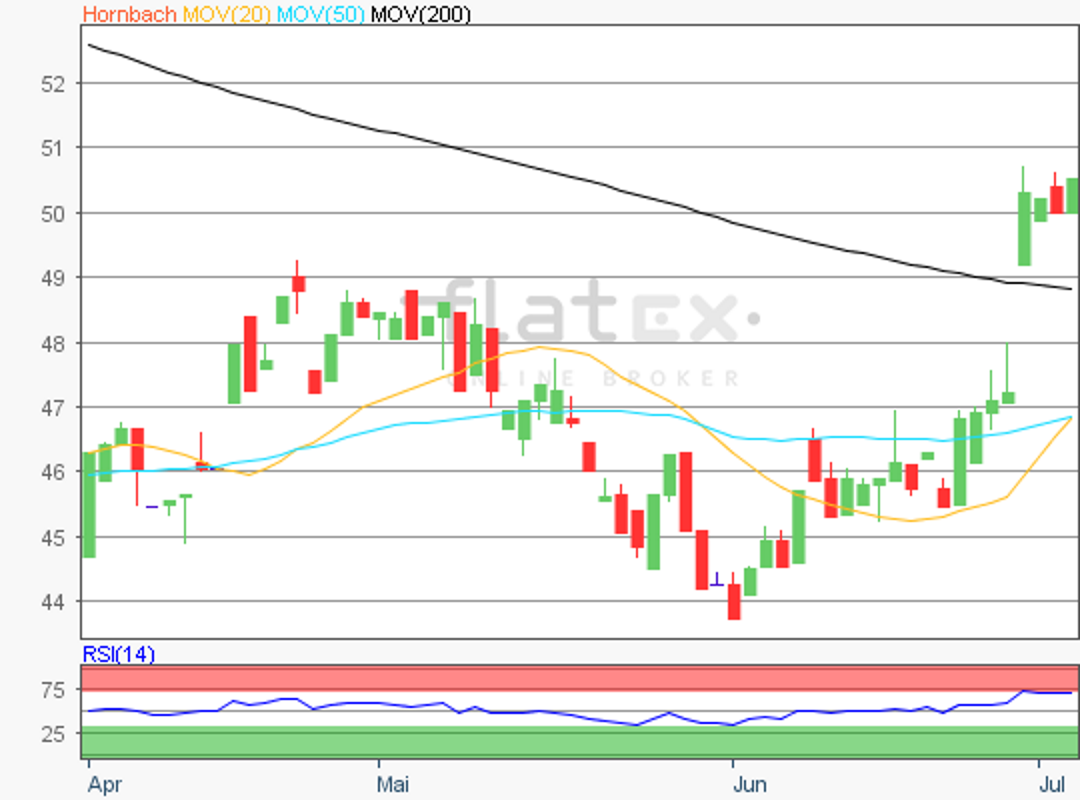 Die Aktie der Baumarktkette Hornbach Holding notierte am 03. Juni 2019 bei 43,50 Euro auf einem letzten Verlaufstief.