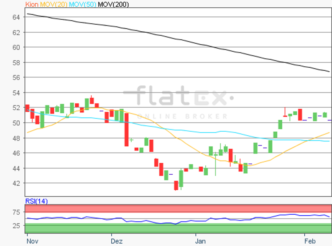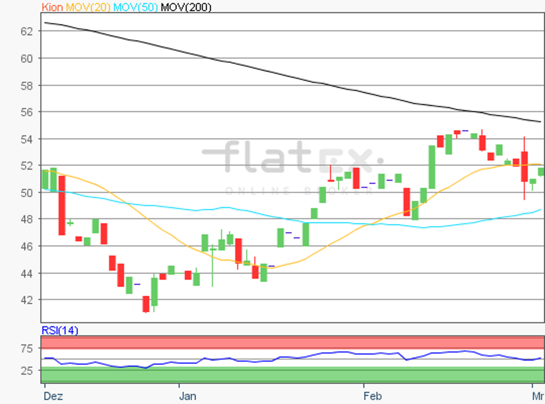 Die Aktie des SDAX-Konzerns Kion Group notierte am 20. Februar 2019 auf einem Zwischenhoch von 54,82 Euro.