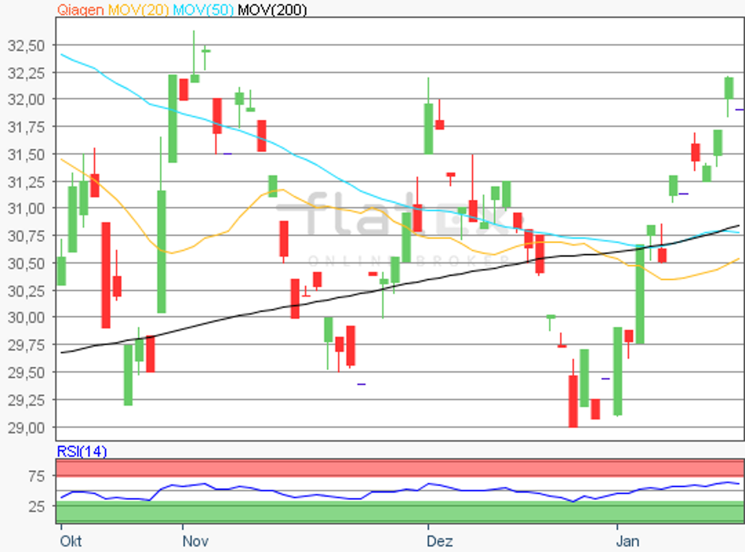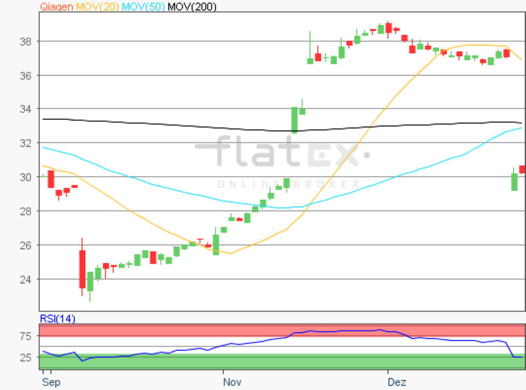 Die Aktie des TecDAX-Konzerns Qiagen notierte am 27. Dezember 2018 auf einem letzten hier relevanten Verlaufstief von 29,01 Euro.