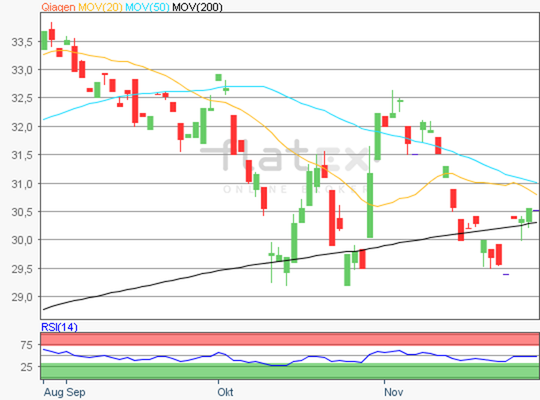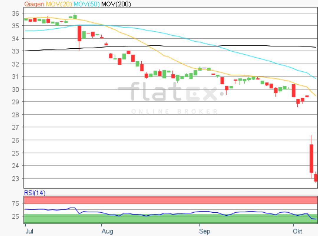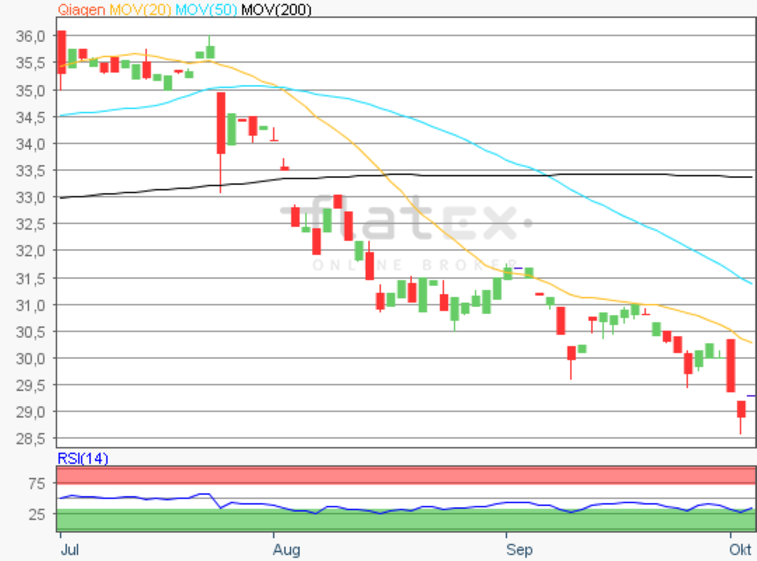 Die Aktie des MDAX- und TecDAX-Konzerns Qiagen notierte am 09. Oktober 2019 auf einem letzten Verlaufstief von 22,54 Euro.