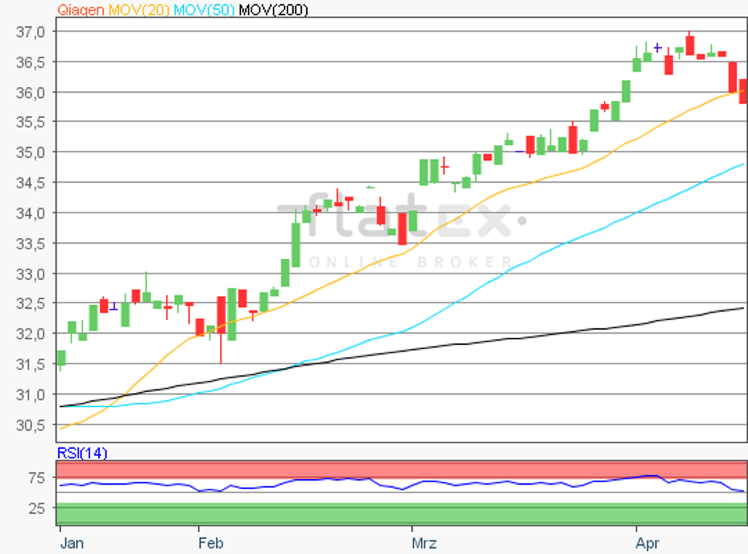 Die Aktie des MDAX- und TecDAX-Konzerns Qiagen bildete am 08. April 2019 ein Hoch von 37,03 Euro aus.