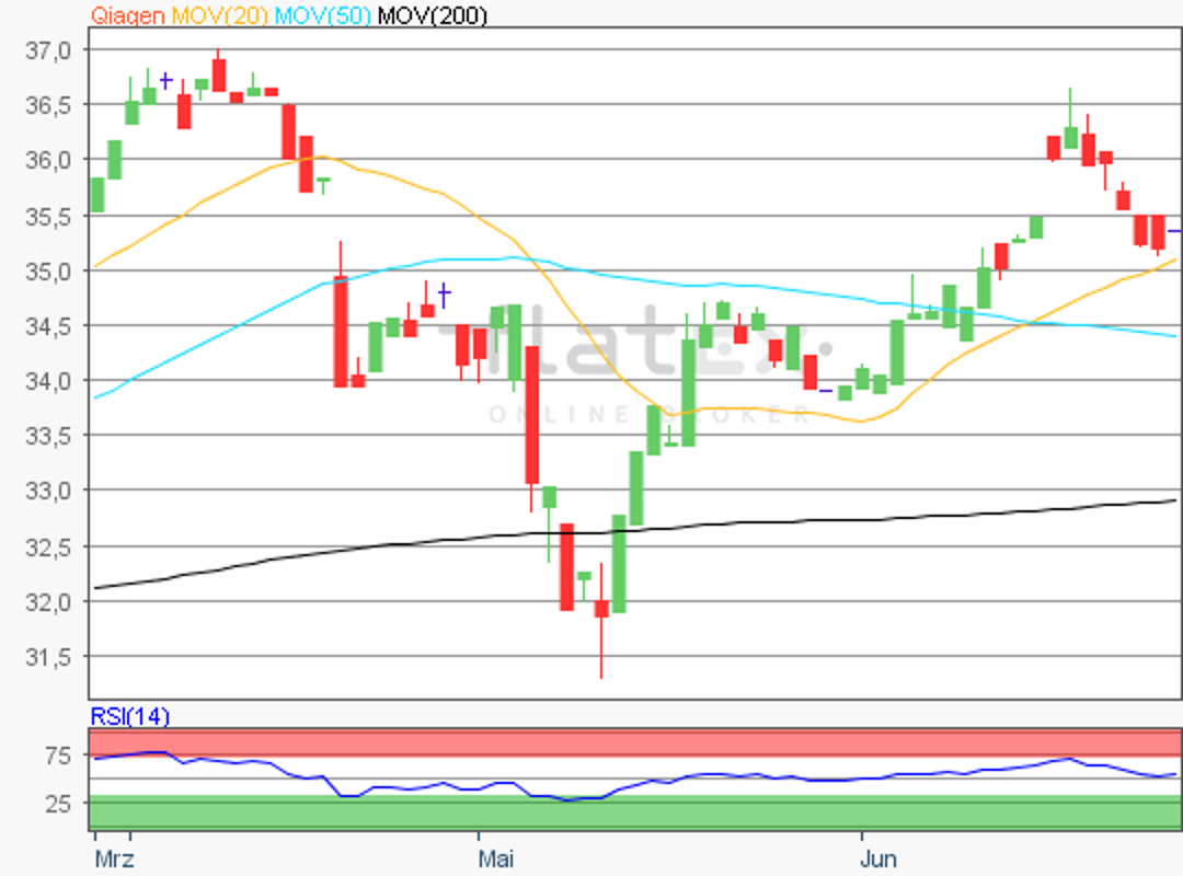Die Aktie des MDAX- und TecDAX-Konzerns Qiagen notierte am 13. Mai 2019 auf einem Verlaufstief von 31,66 Euro.
