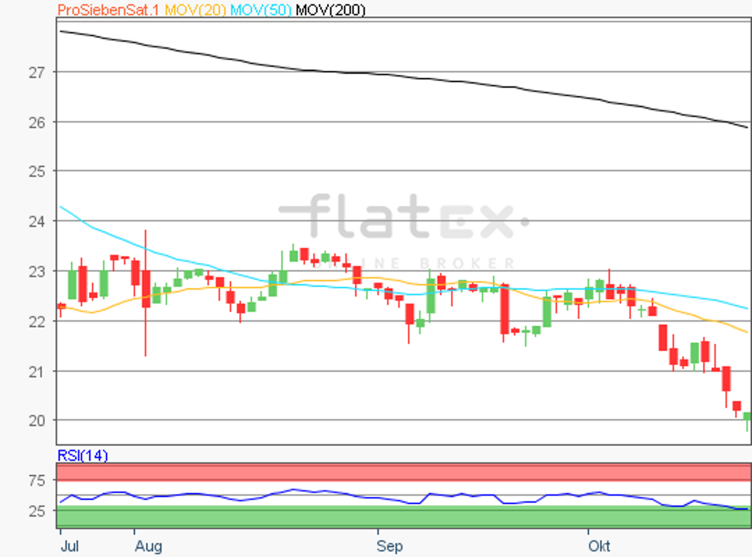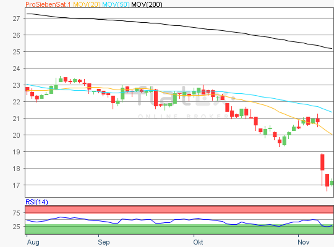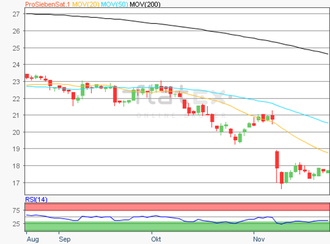 Die Aktie des MDAX-Konzerns ProSiebenSat.1 bildete am 14. November 2017 bei 24,50 Euro ein Verlaufstief aus.