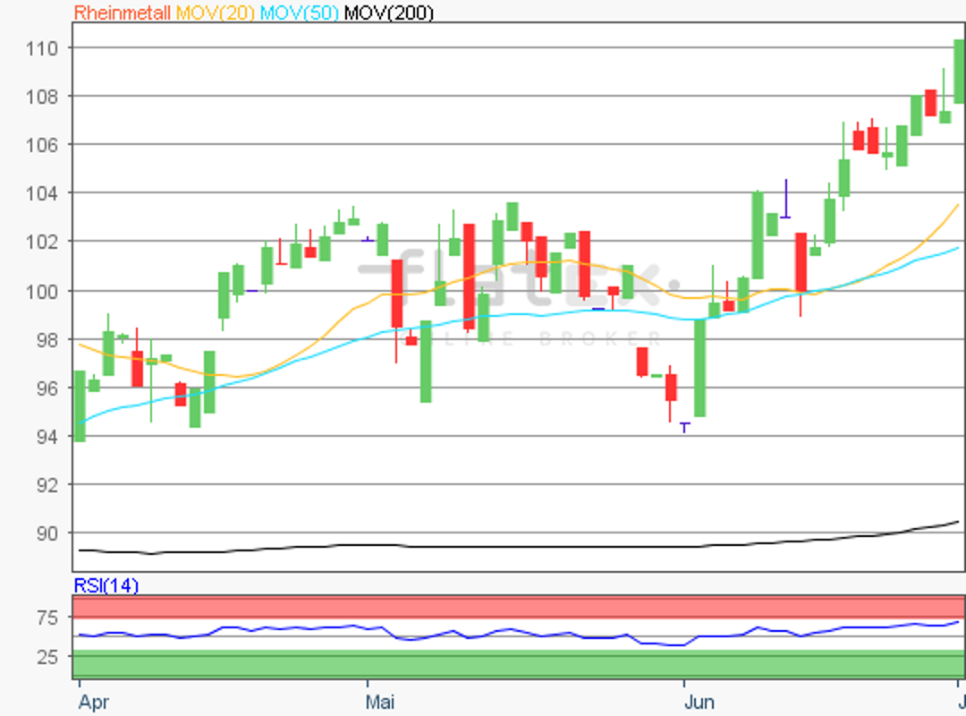 Die Aktie des MDAX-Konzerns Rheinmetall notierte am 01. Juli 2019 bei 110,90 Euro auf einem letzten Hoch.