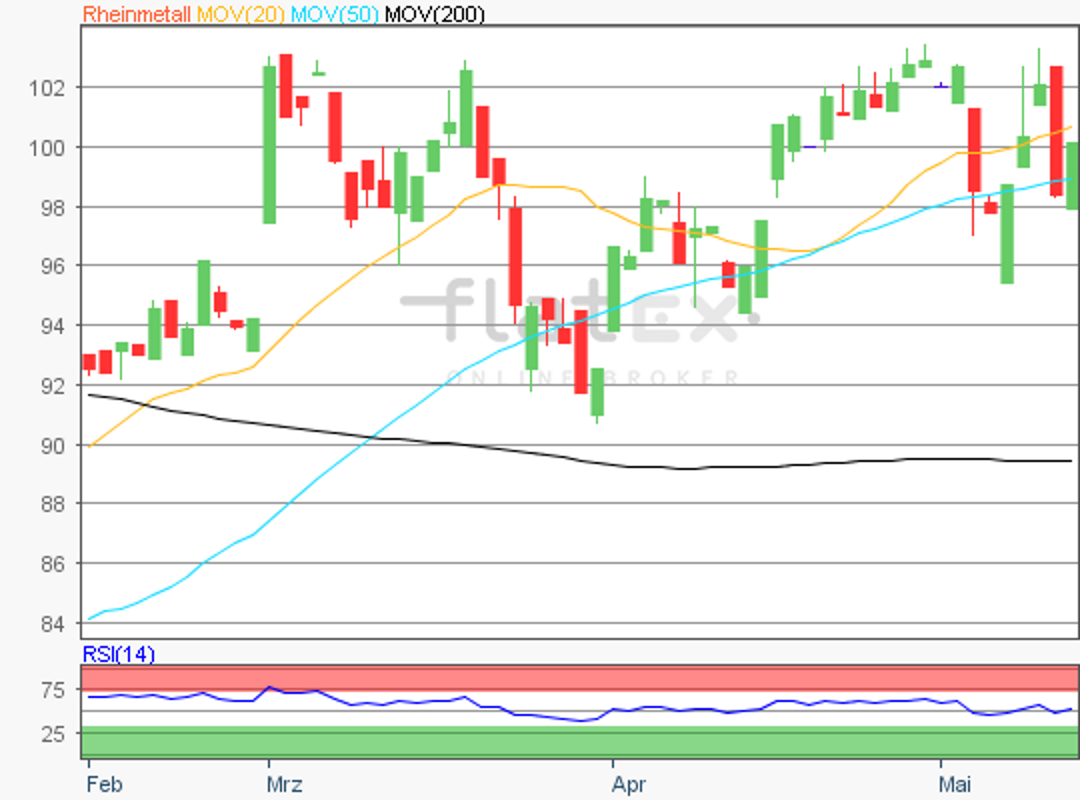 Die Aktie des MDAX-Konzerns Rheinmetall bildete am 09. Mai 2019 ein Zwischenhoch von 104,35 Euro aus.