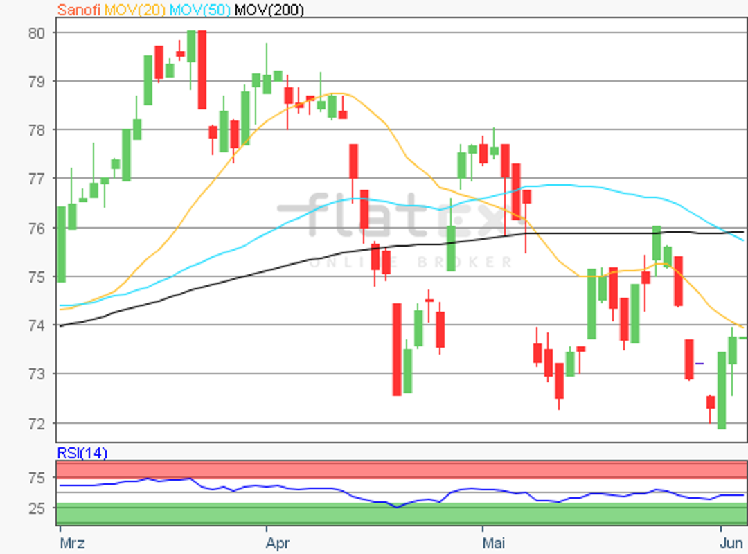 Die Aktie des EuroStoxx50-Konzerns Sanofi bildete am 15. Mai 2017 bei 92,88 Euro ein Jahreshoch aus.