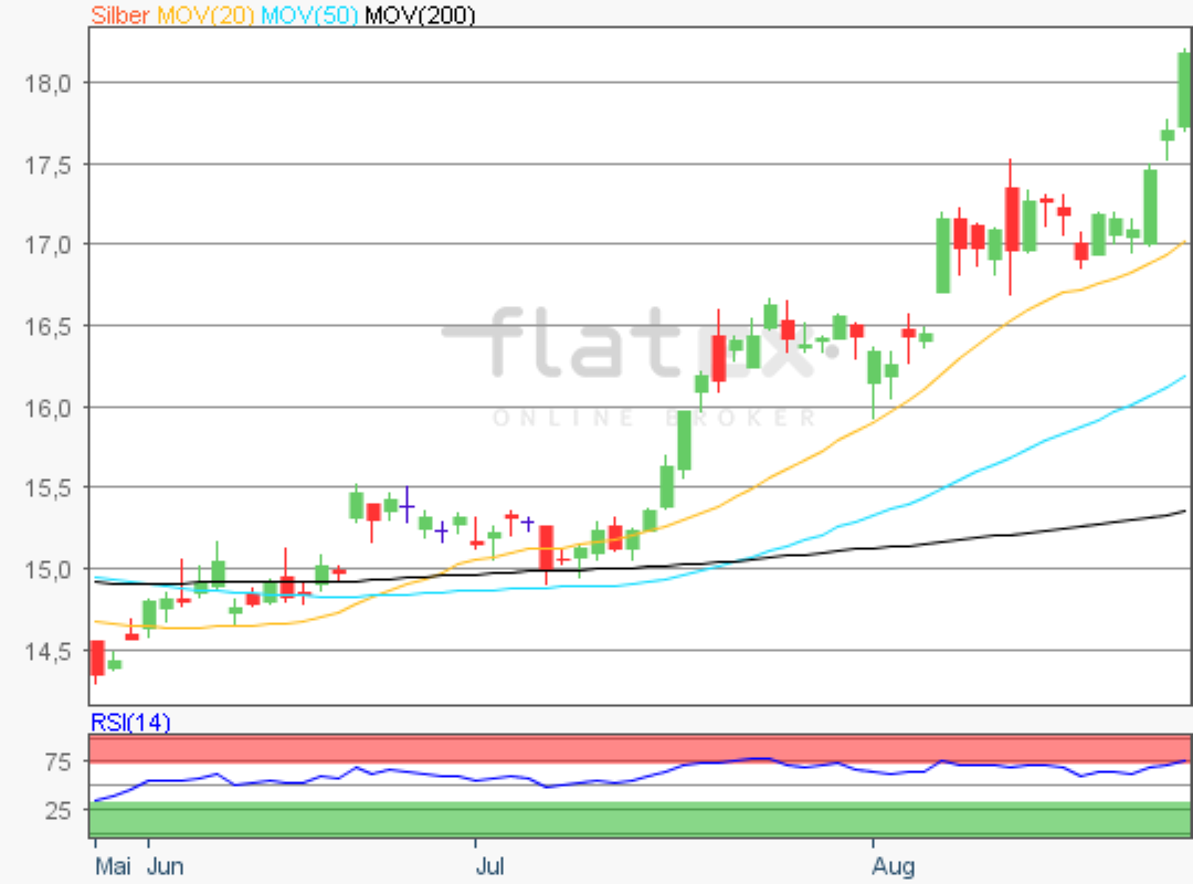 Der Preis für eine Feinunze Silber befindet sich in einer Rally und notiert so hoch wie seit über zwei Jahren nicht mehr.