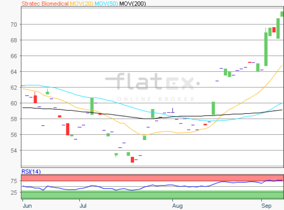 Die Aktie des Medizintechnikkonzerns Stratec Biomedical bildete am 03. August 2018 ein Hoch von 77,20 Euro aus.
