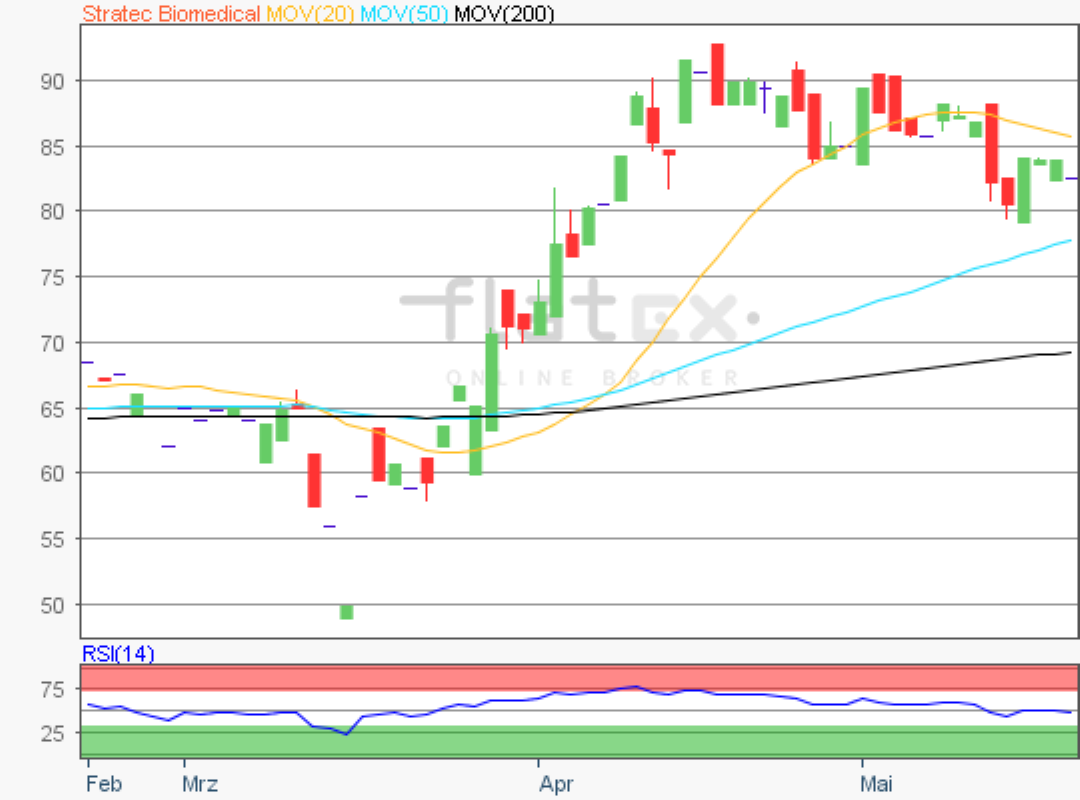 Die Aktie des Medizintechnik-Konzerns Stratec Biomedical notierte am 09. April 2018 auf einem letzten übergeordneten Hoch von 80,40 Euro.