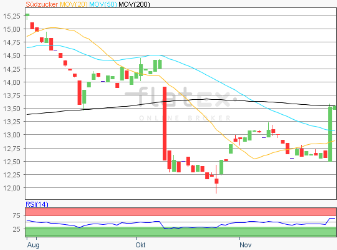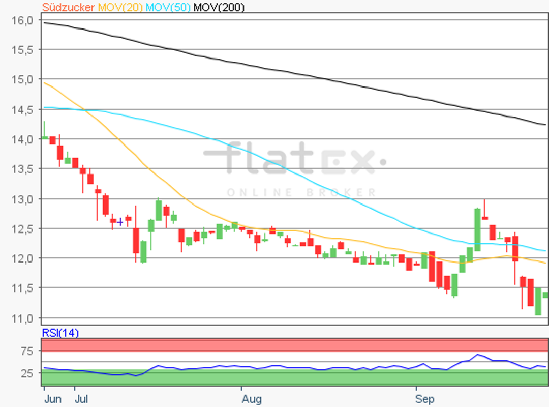 Die Aktie des SDAX-Konzerns Südzucker bildete am 27. März 2018 bei 13,00 Euro ein Verlaufstief aus.