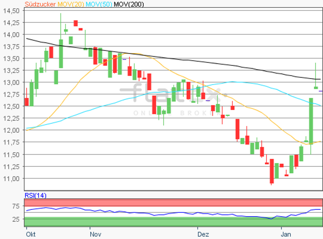 Die Aktie des SDAX-Konzerns Südzucker fiel vom 25. Oktober 2018 von einem Zwischenhoch von 14,57 Euro und bildete am 27. Dezember 2018 ein übergeordnetes Tief von 10,85 Euro aus.