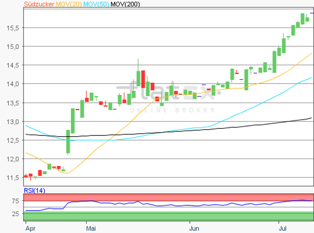 Die Aktie des SDAX-Konzerns Südzucker notierte am 10. Juli 2019 auf einem Zwischenhoch von 16,20 Euro.