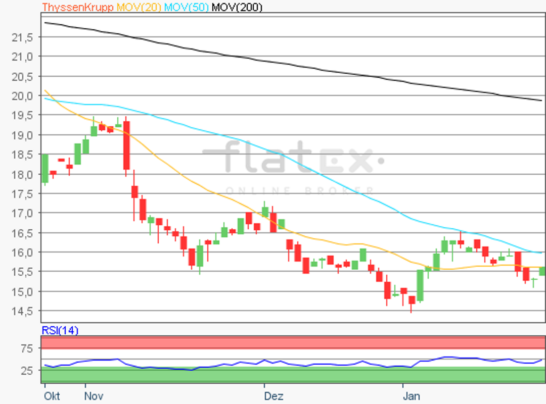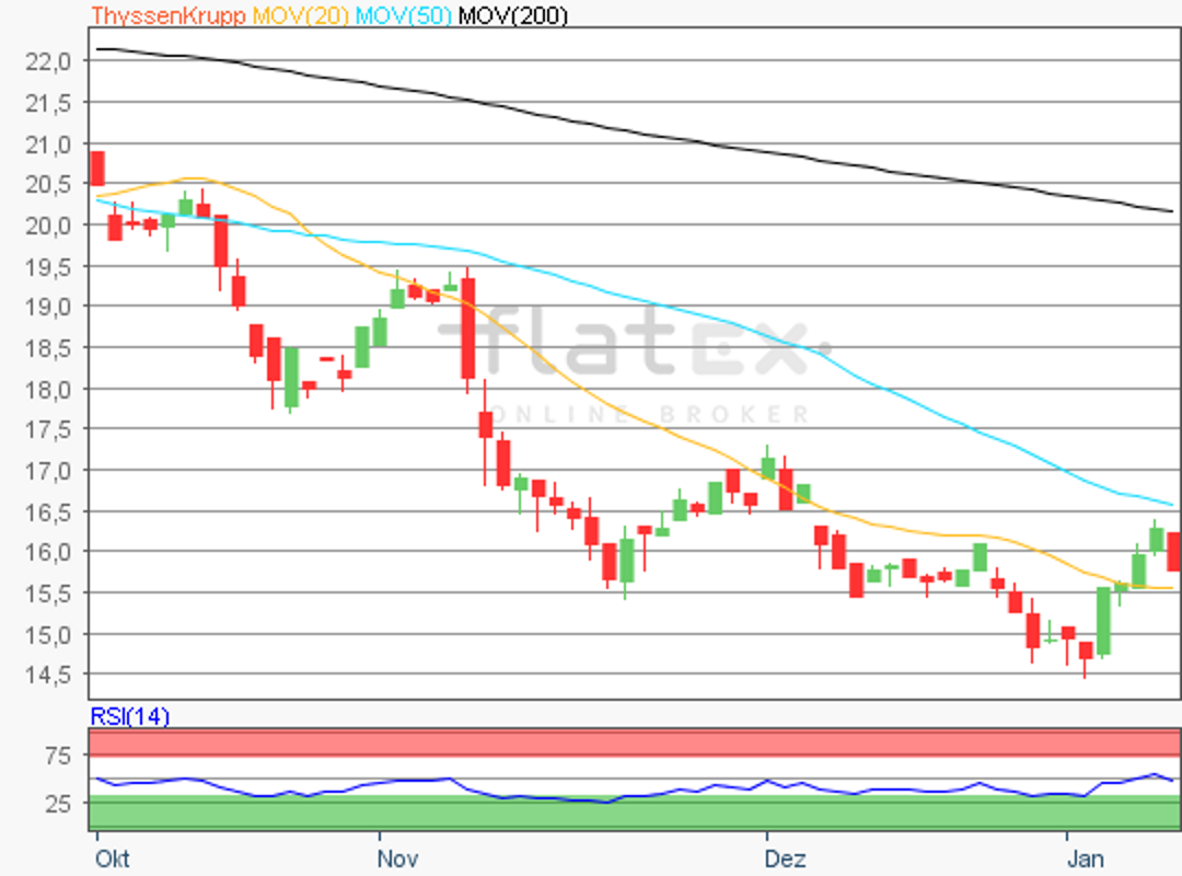 Die Aktie des DAX-Konzerns ThyssenKrupp notierte am 03. Januar 2019 bei 14,42 Euro auf einem Verlaufstief.