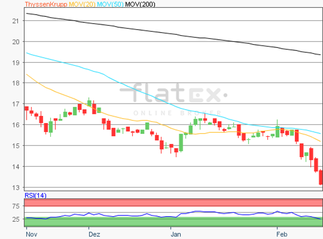 Einen weiteren negativen Rekord markierte gestern die Aktie von ThyssenKrupp. Mit einem Minus von 3,15 Prozent schloss die Aktie bei 11,23 Euro, ein neues Jahrestief.