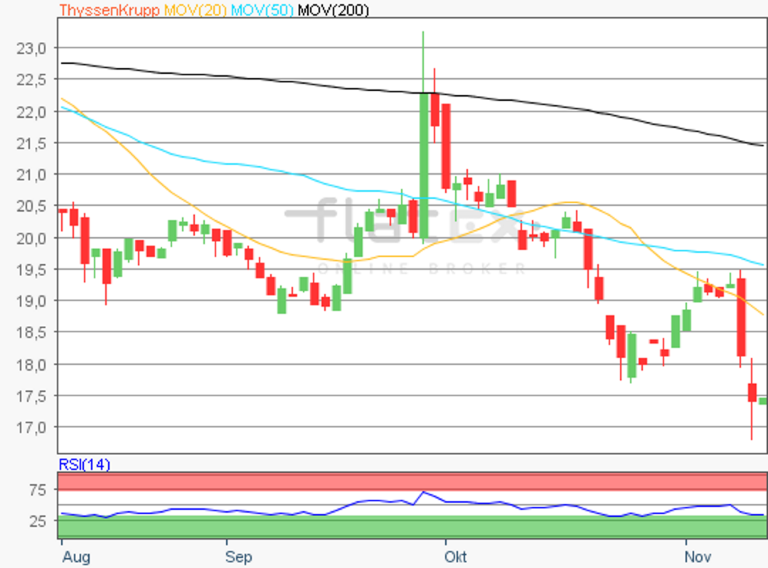 Die Aktie des DAX-Konzerns ThyssenKrupp notierte am 25. Oktober 2018 auf einem Verlaufstief von 17,66 Euro.