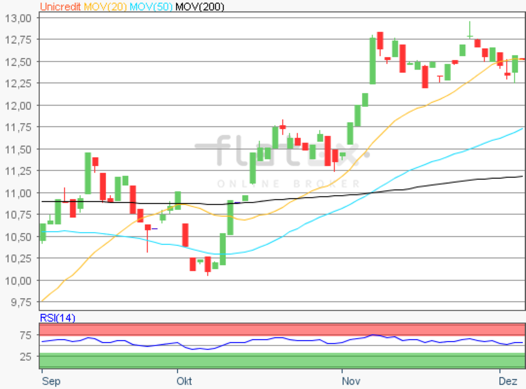 Die Aktie der italienischen Großbank UniCredit notierte am 13. Dezember 2019 auf einem letzten Hoch von 13,69 Euro.