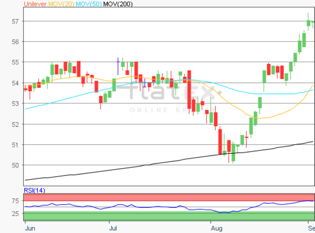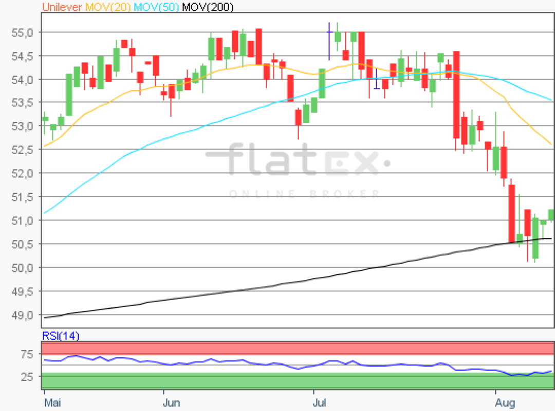 Die Aktie des EuroStoxx50-Konzerns Unilever notierte am 07. August 2019 auf einem Verlaufstief von 50,10 Euro.