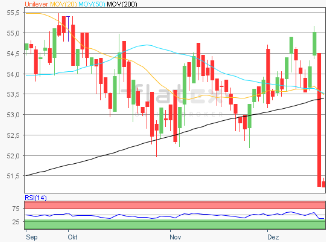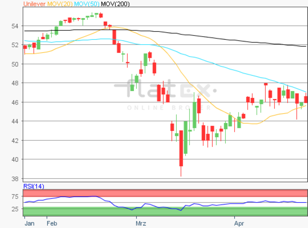 Die Aktie des EuroStoxx50-Konzerns Unilever notierte am 31. Januar 2019 auf einem Verlaufstief von 45,56 Euro.