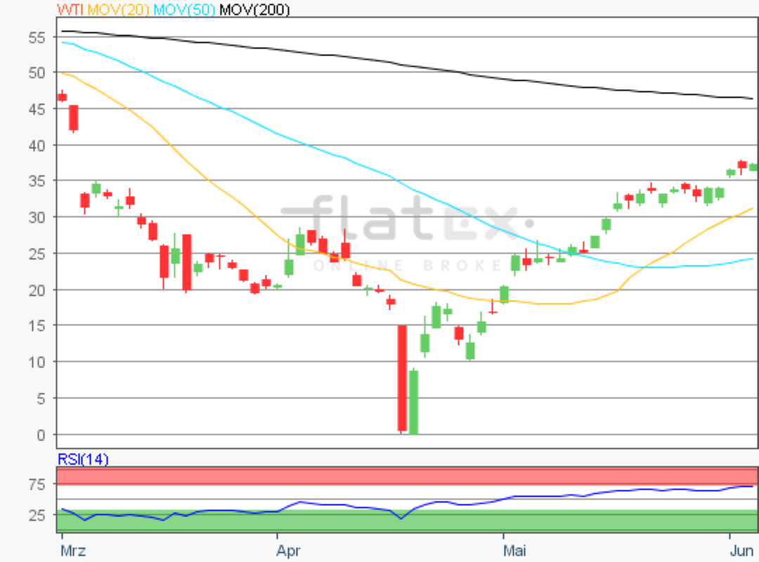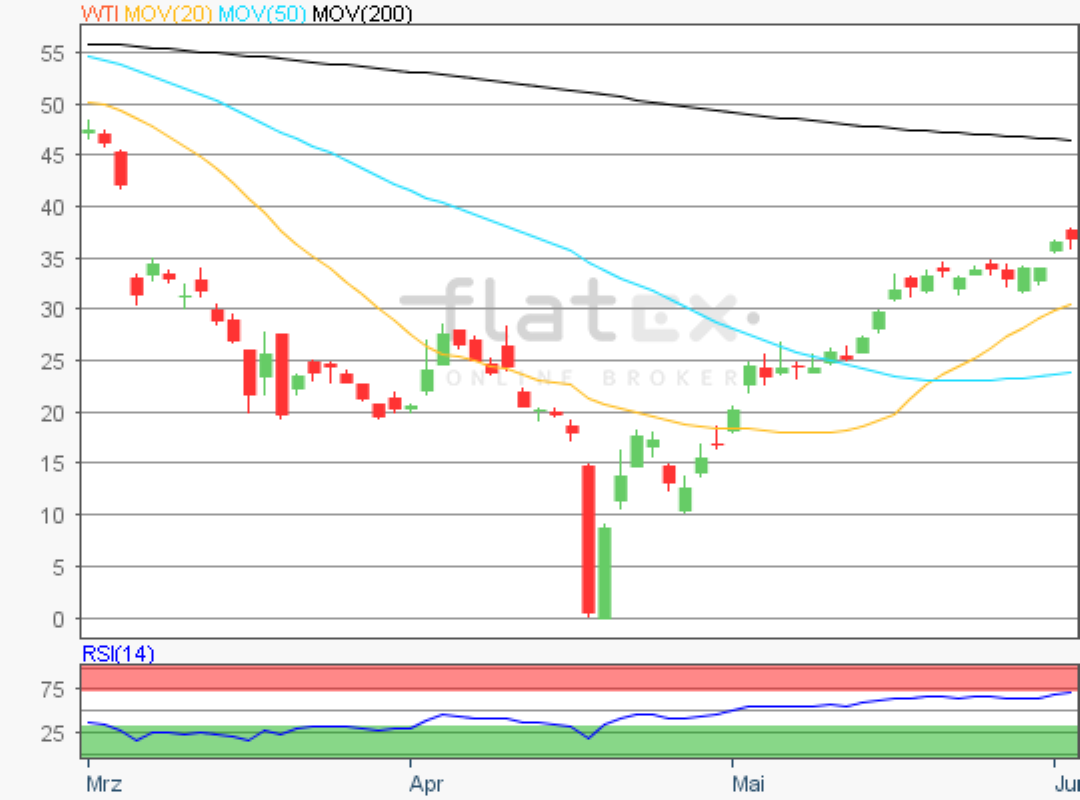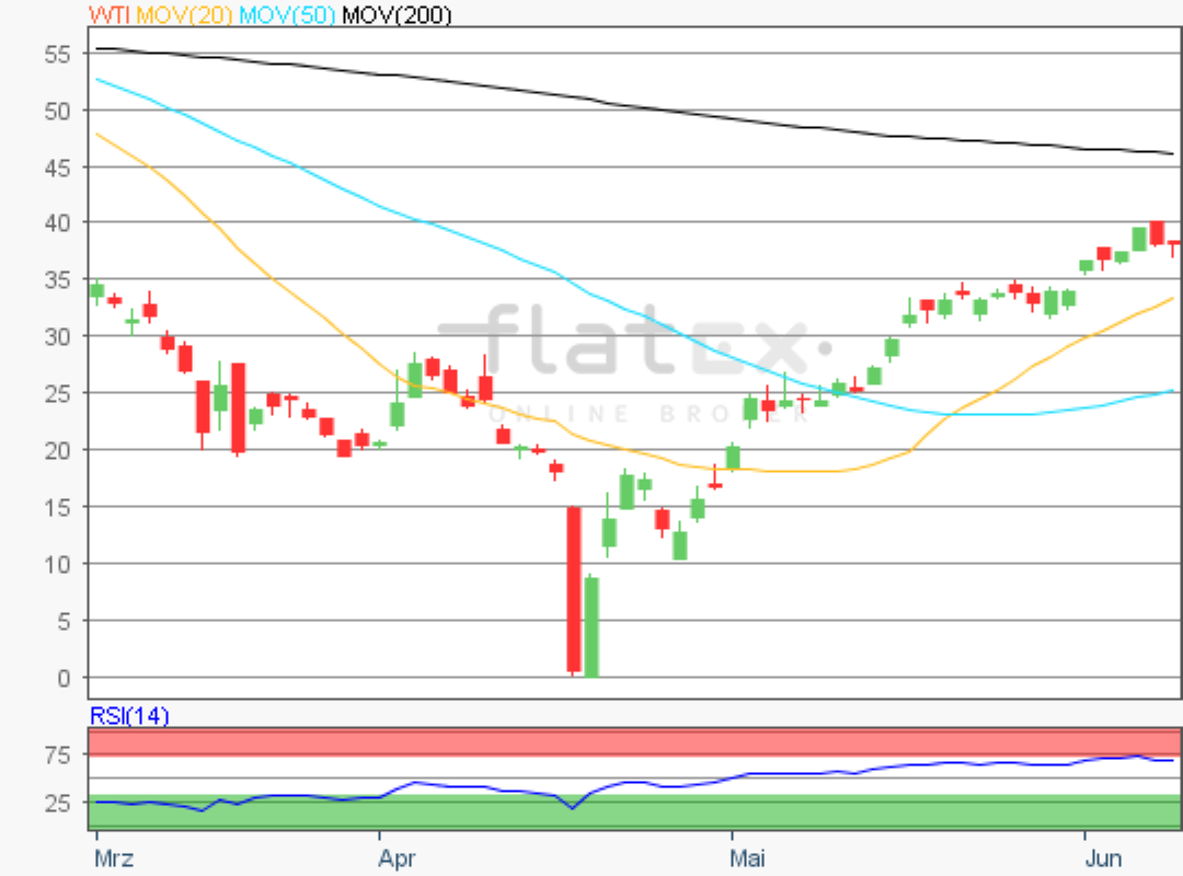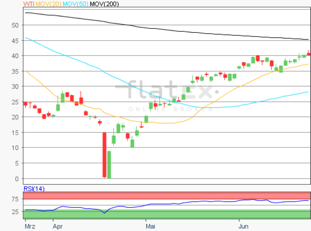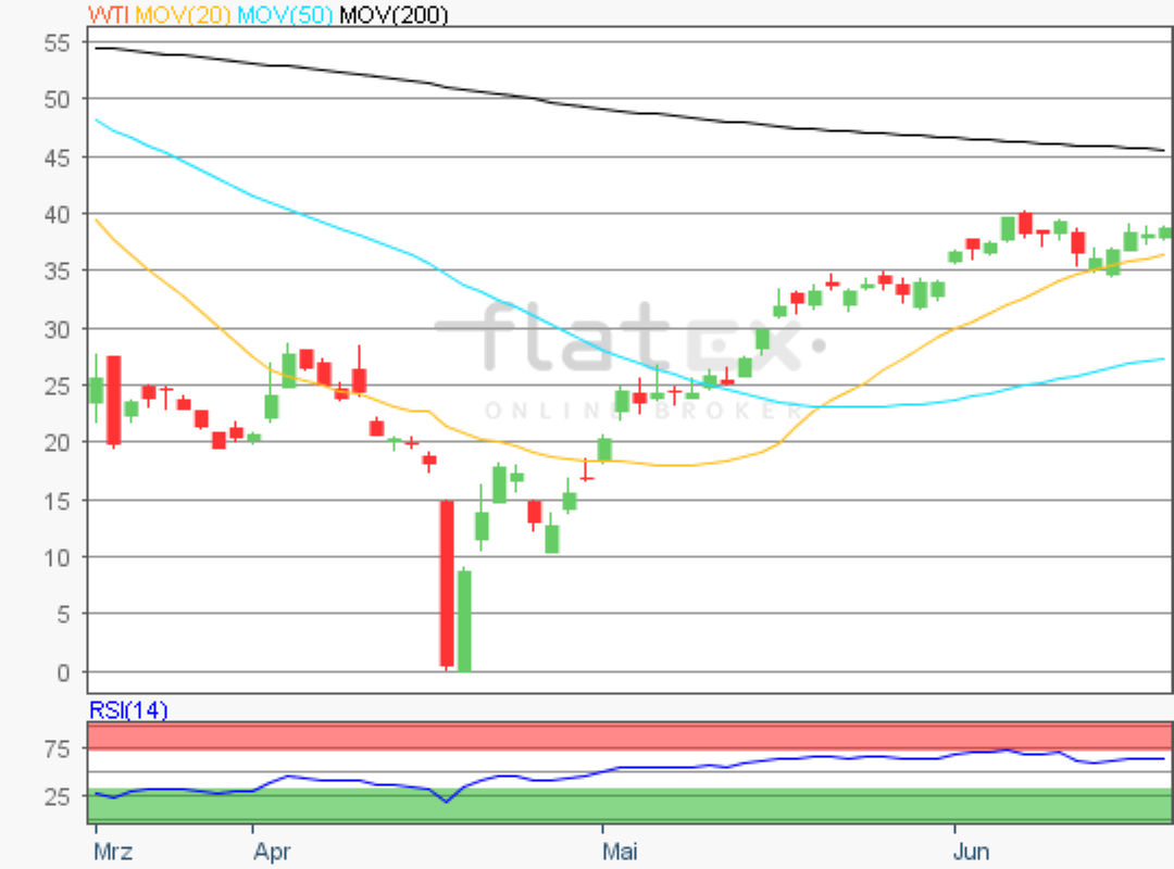 Der Preis für ein Fass Rohöl der US-Sorte WTI drehte deutlich vor dem Erreichen des Kurslückenschlusses (wäre bei 42,17 US-Dollar der Fall gewesen) nach Süden ab.