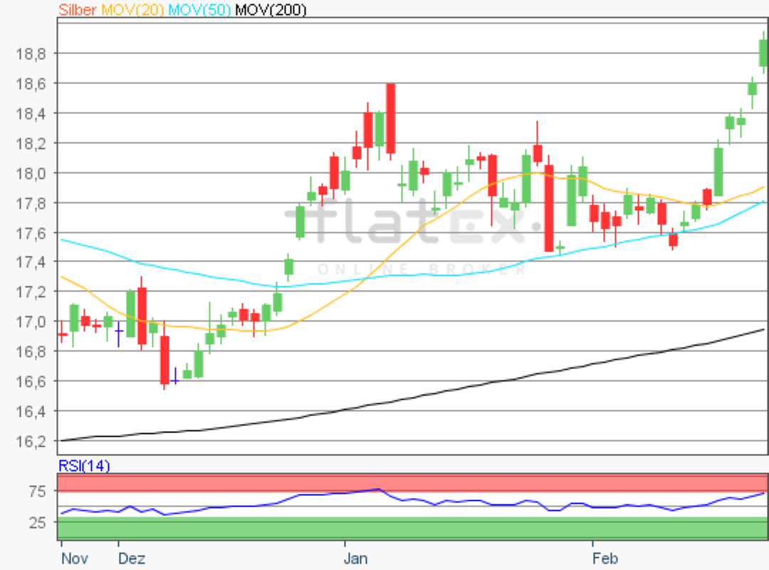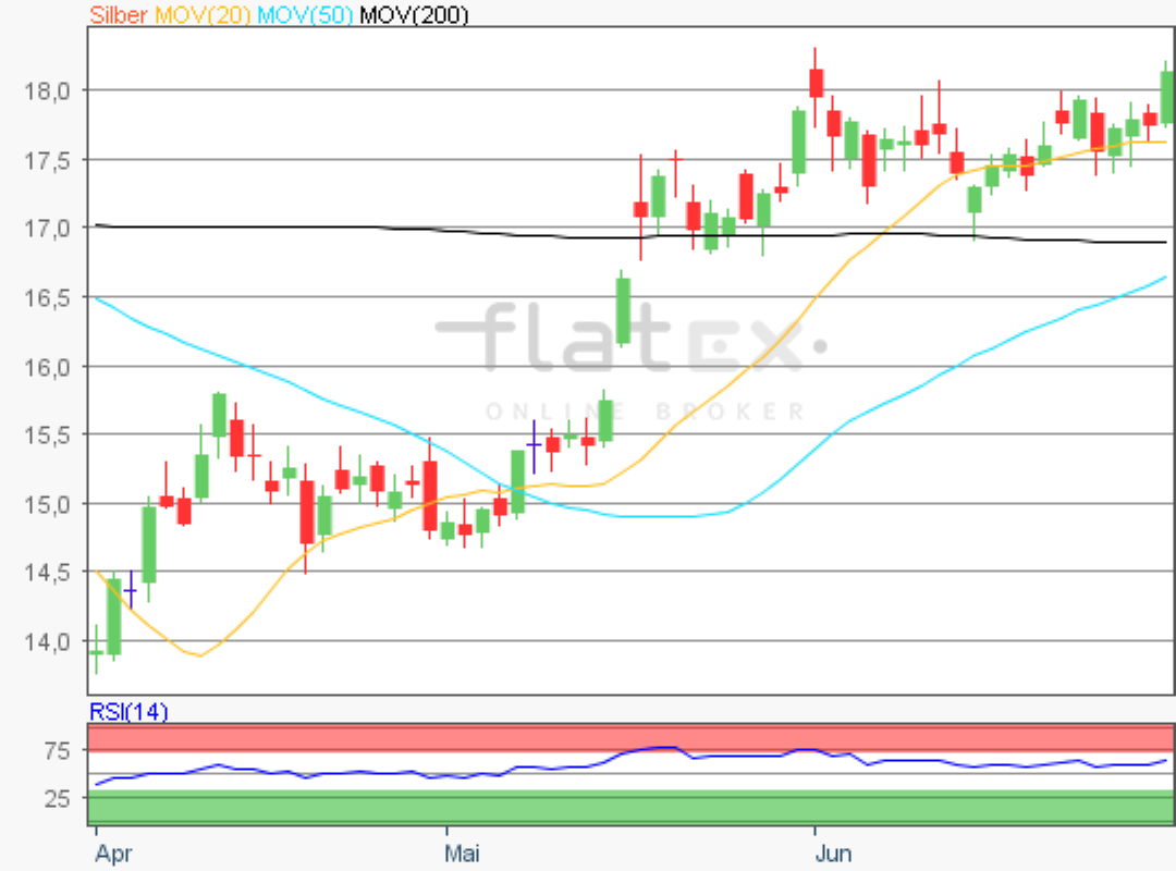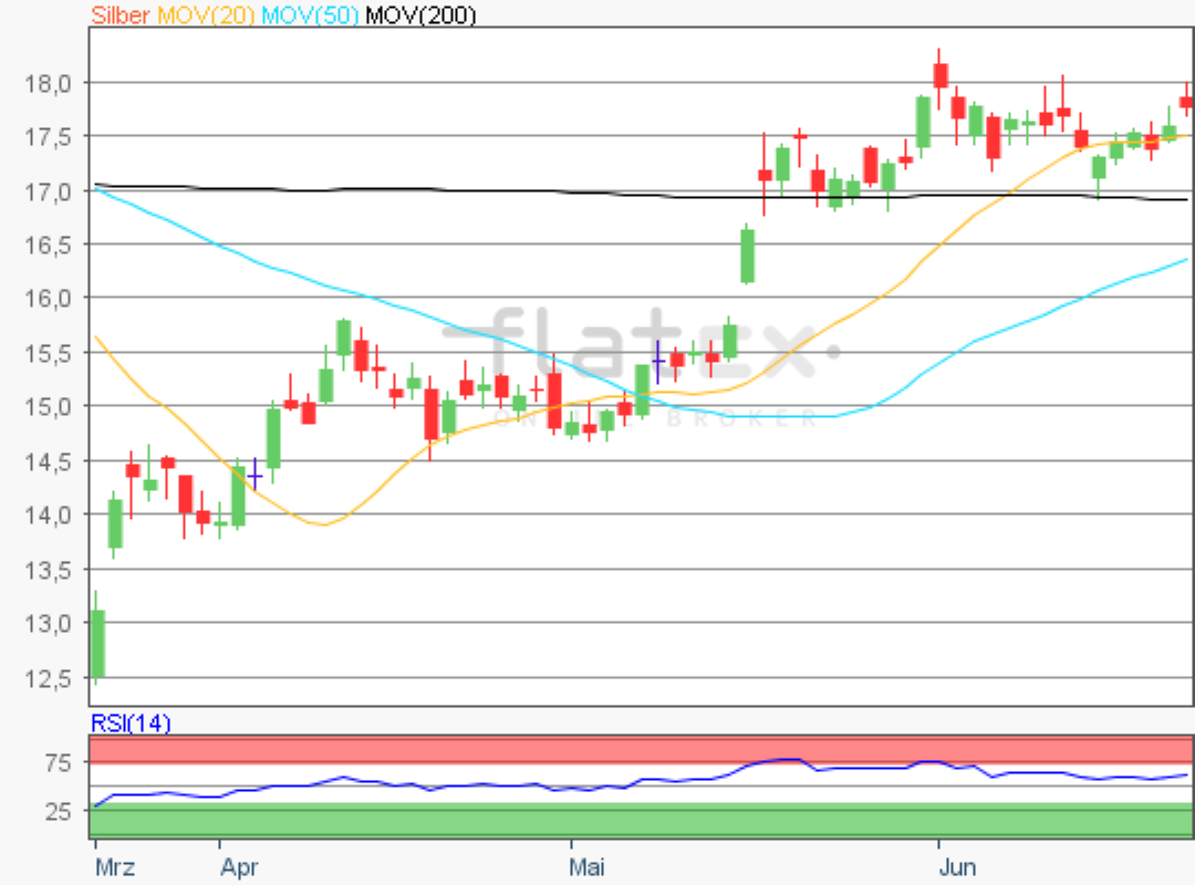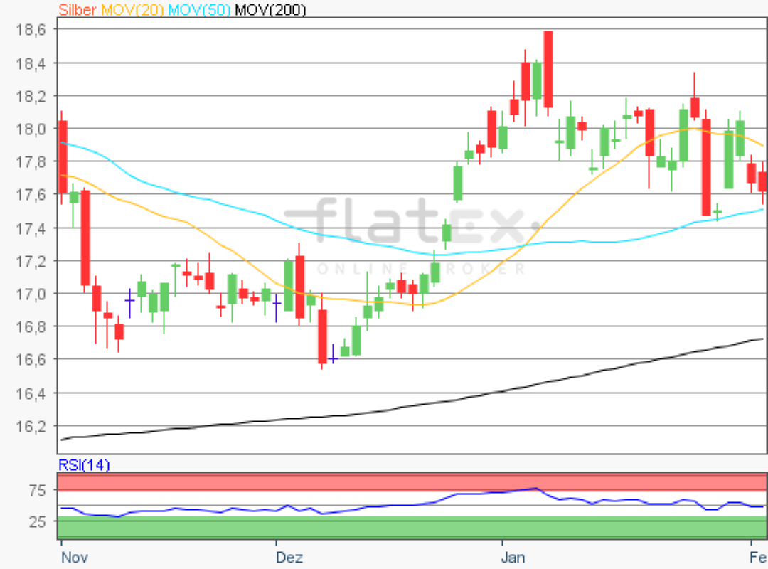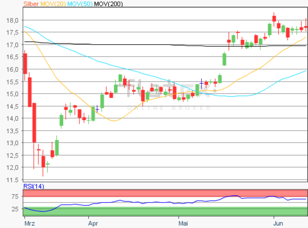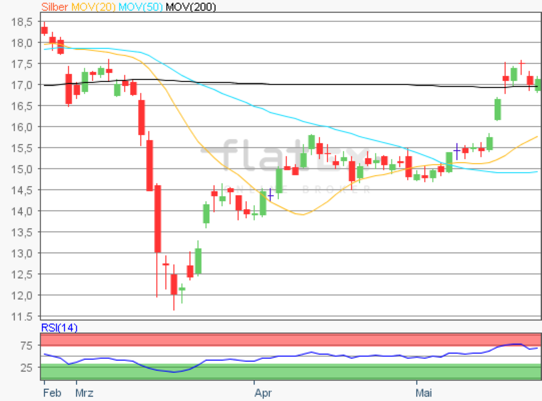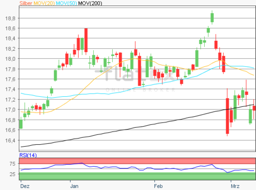 Der Preis für eine Feinunze Silber bewegte sich zum Zeitpunkt dieser Analyse im Bereich der Marken von 16,56 US-Dollar im Tief und rund 17,60 US-Dollar im Hoch.